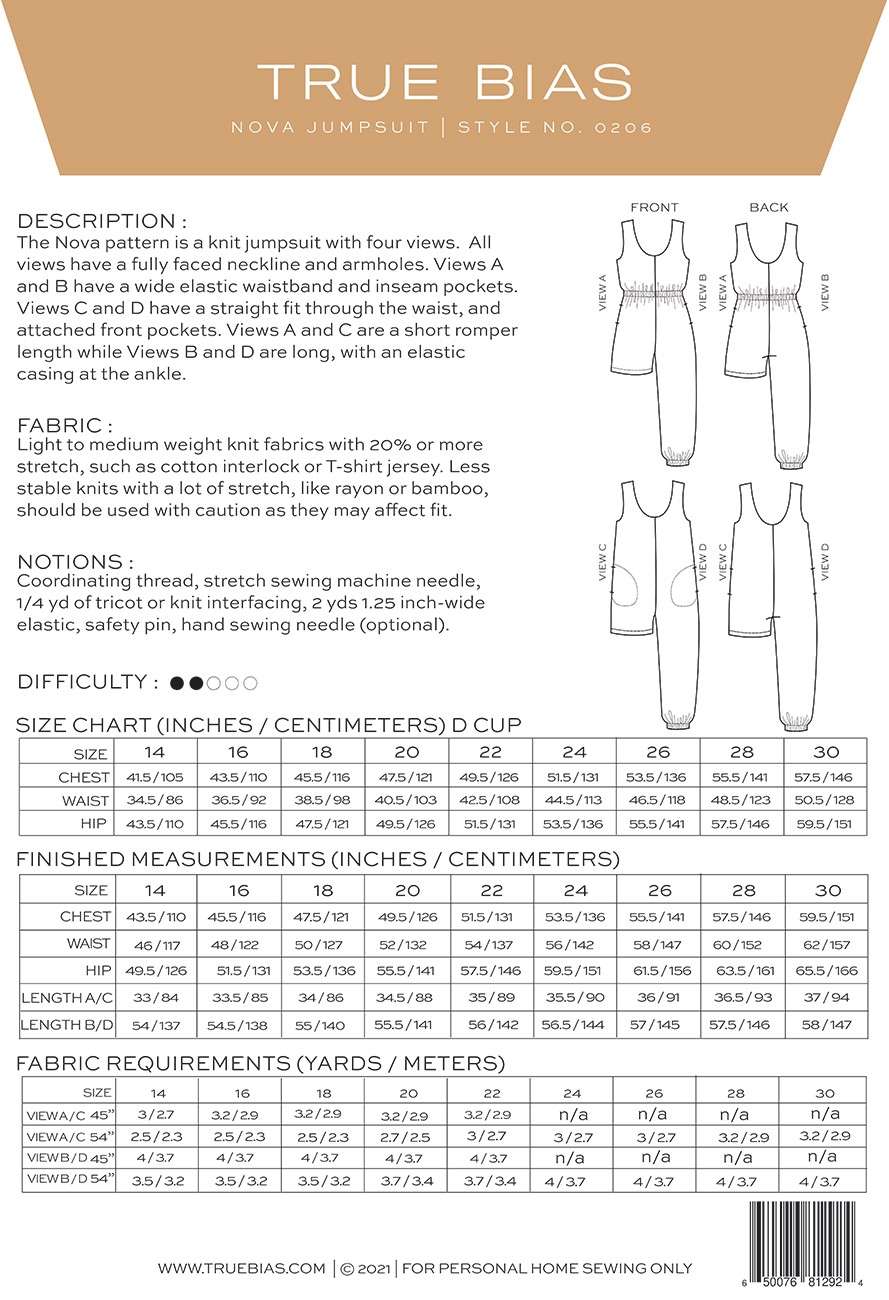 The Nova pattern is a knit jumpsuit with four views. All views have a fully faced neckline and armholes. Views A and B have a wide elastic waistband and inseam pockets. Views C and D have a straight fit through the waist and attached front pockets. Views A and C are a short romper length while Views B and D are long with an elastic casing at the ankle.