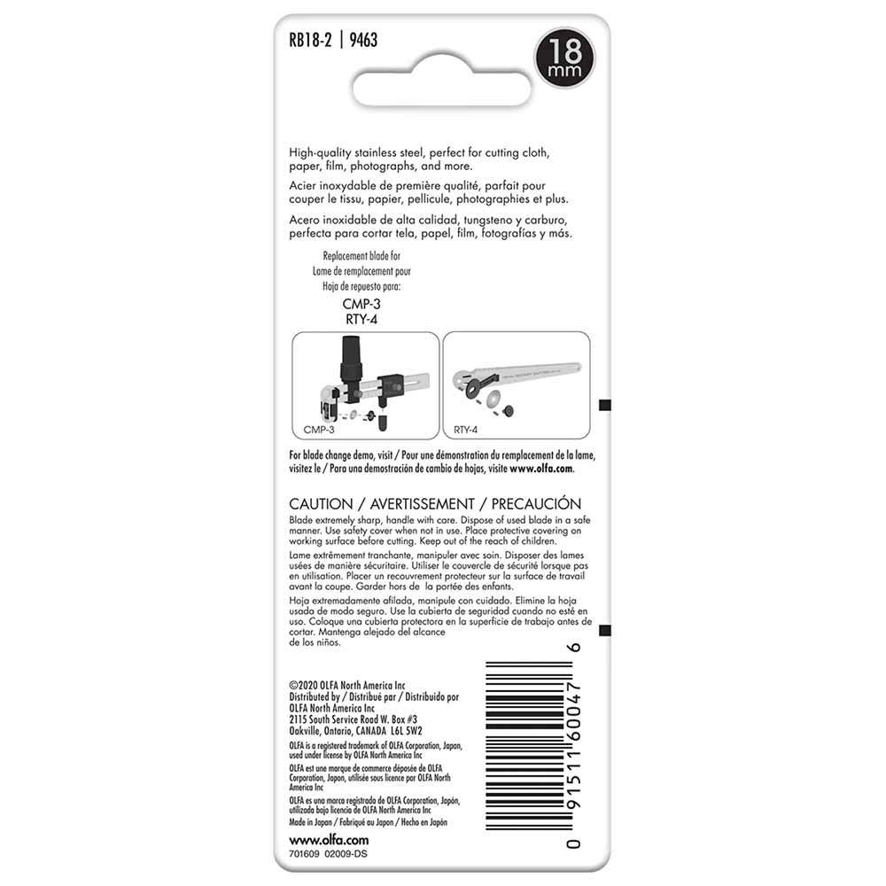 Circular rotary replacement blade for our 18mm rotary cutter used for quilting, sewing, scrapbooking, and general crafts. Perfect for intricate and detailed cutting, this blade is ideal for small-scale projects, and for cutting curved pieces and tight corners. And, it's sharp enough to handle the toughest material. This blade is made of stainless steel for sharpness and durability. For use with the 18mm Rotary Cutter (RTY-4) and Rotary Circle Cutter (CMP-3). 2 blades per pack. Good For: detail or curved cutting on fabric, scrapbooking and miniature quilting.