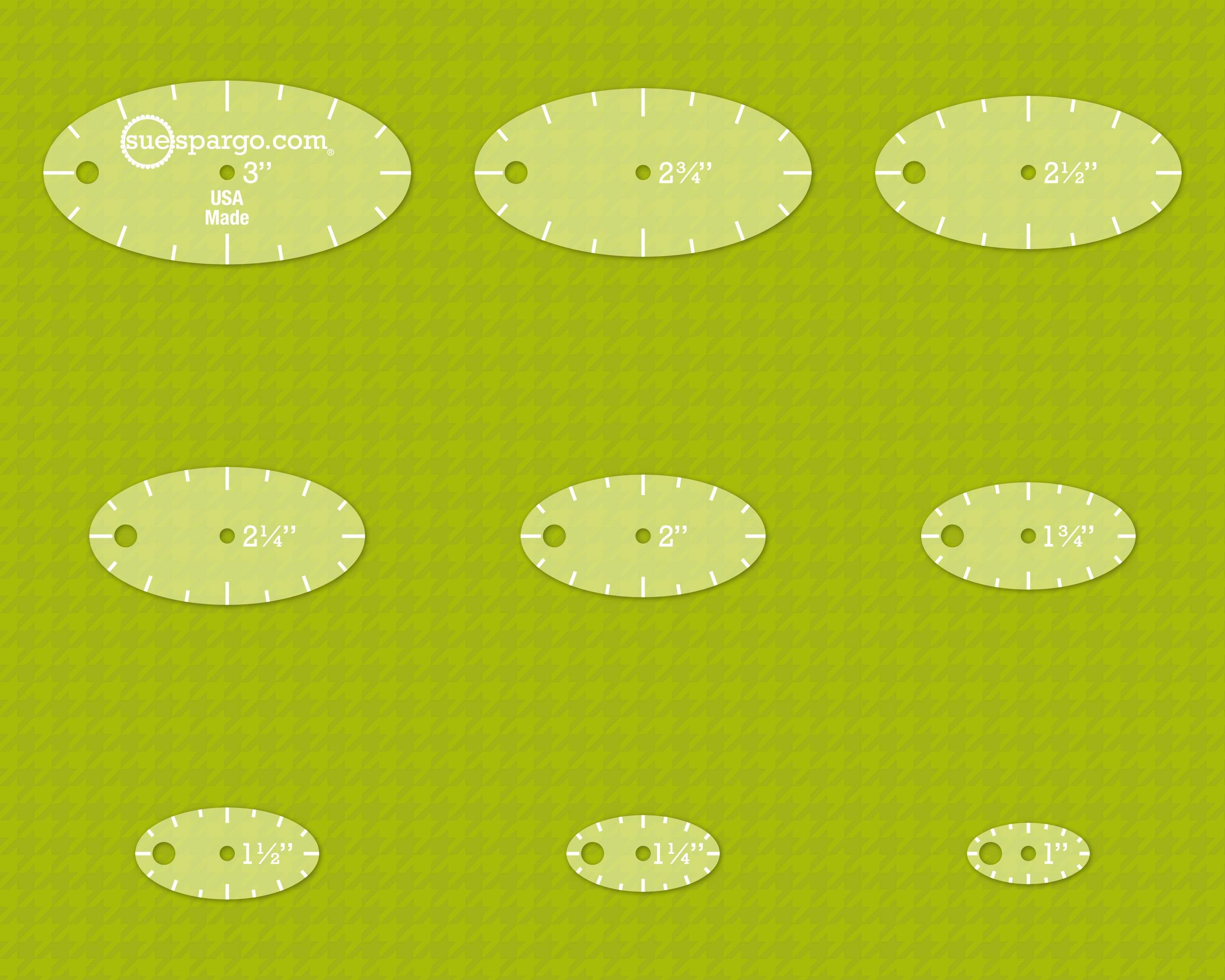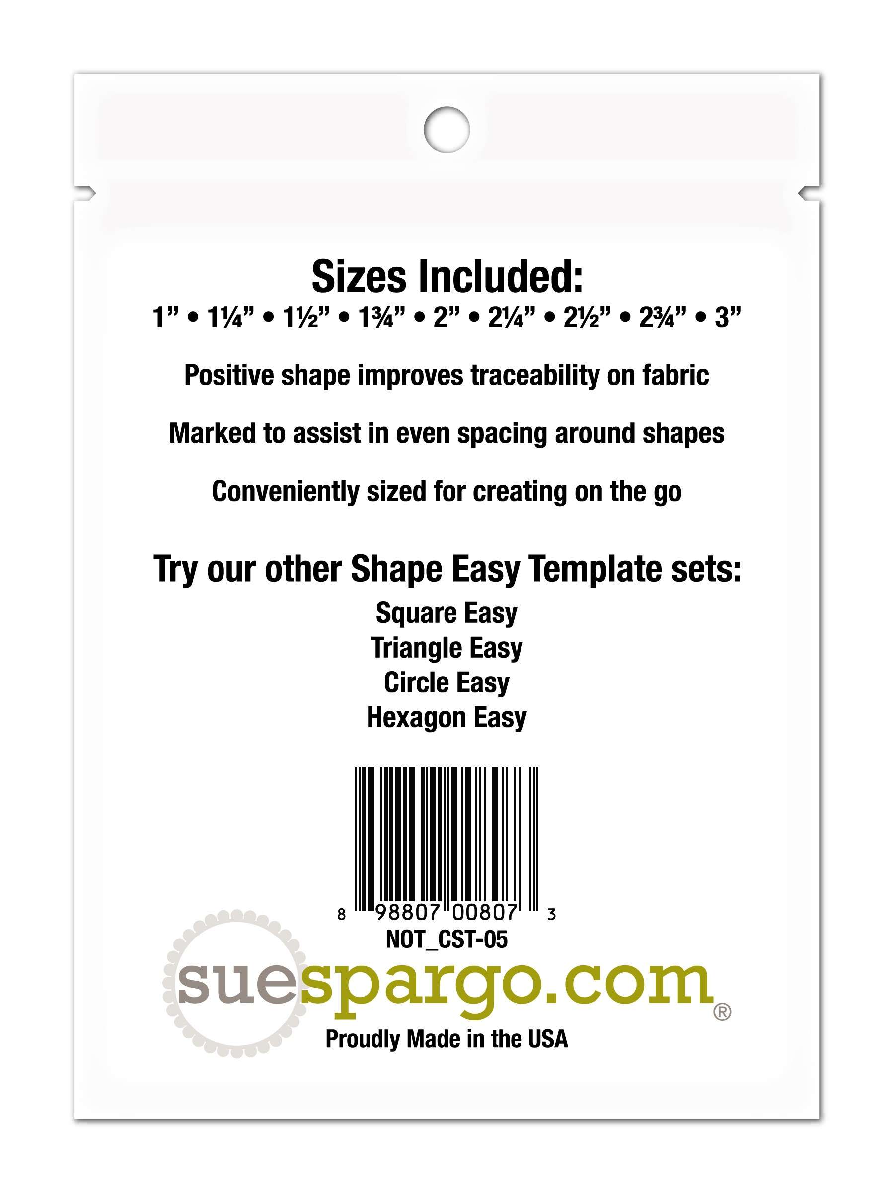 Designed in Sue Spargo’s studio, these high quality, large bodied templates are ideal for directly tracing shapes onto Wool, Cotton, Linen or other materials. Each template contains markings to plan, mark and evenly space your stitches around each shape. Each set contains nine templates. Sizes include: 1", 1.25", 1.5", 1.75", 2", 2.25", 2.5", 2.75", 3" Each template contains evenly spaced markings for quick and easy planing of perfectly spaced stitches each and every time! Uses: mark directly on Wool, Cotton, Linen and other materials, create freezer paper and plastic templates, drawing, sketching, embroidery, Sashiko. Proudly Made in the USA. Conveniently sized and great for stitching on the go!