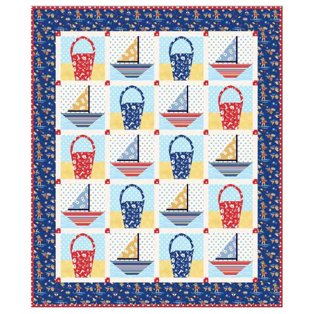 Beach buckets and sailboats are featured in the fun and summery Beach Baby Quilt pattern. Paper templates included.