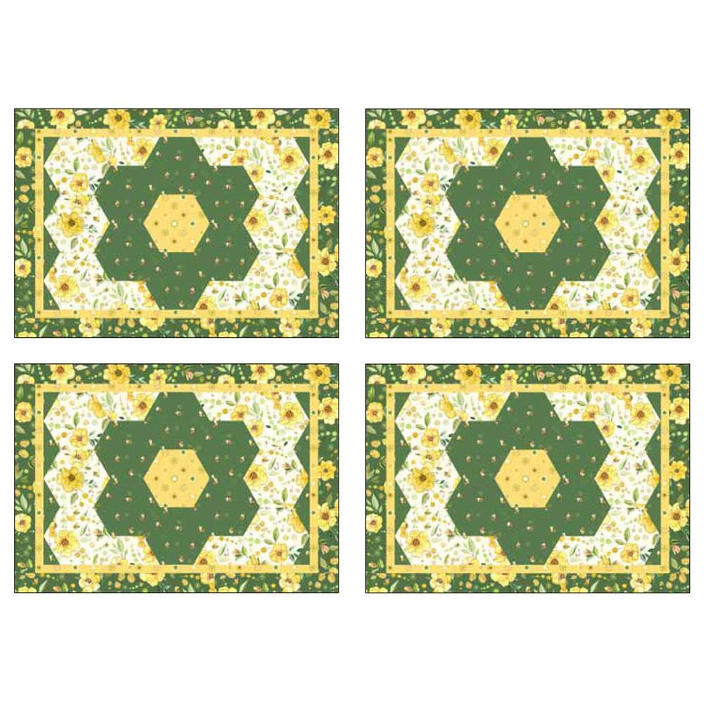 The Botanical Nectar Placemat pattern is by Cyndi Hershey and features a floral design made with hexagons. Paper templates included.