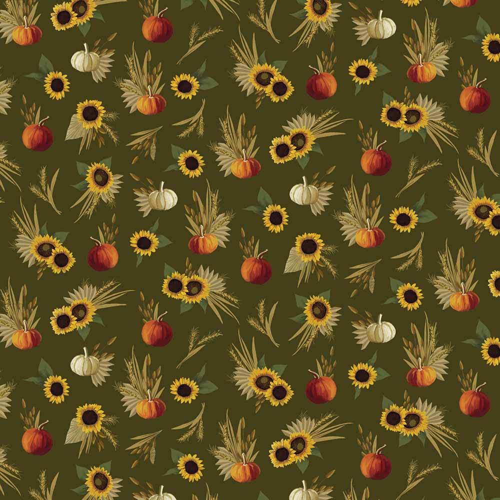 P&B Textiles - Harvest Mini's By Pink Light Studio - Sunflowers & Pumpkins - Dark Olive - Yardage