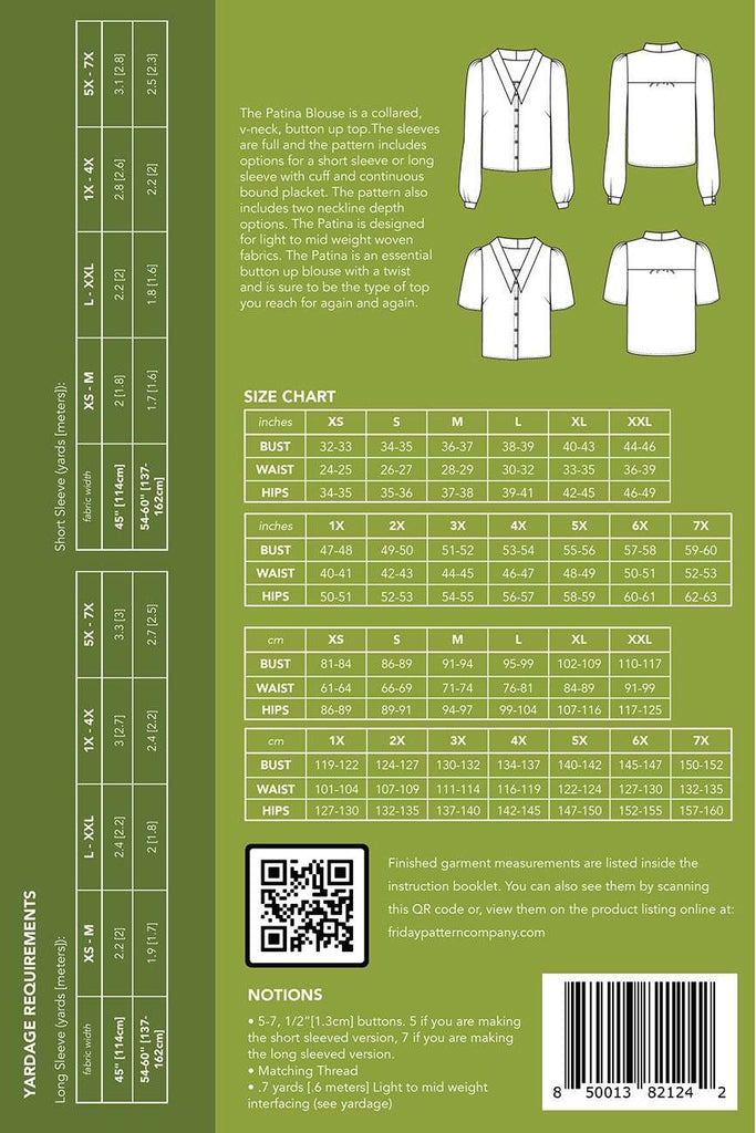 The Patina Blouse is a collared, v-neck, button up top. The sleeves are full and the pattern includes options for a short sleeve or long sleeve with cuff and continuous bound placket. It comes with 2 neckline depth options. The Patina is designed for light to mid weight woven fabrics. The Patina is an essential button up blouse with a twist and is sure to be the type of top you reach for again and again.