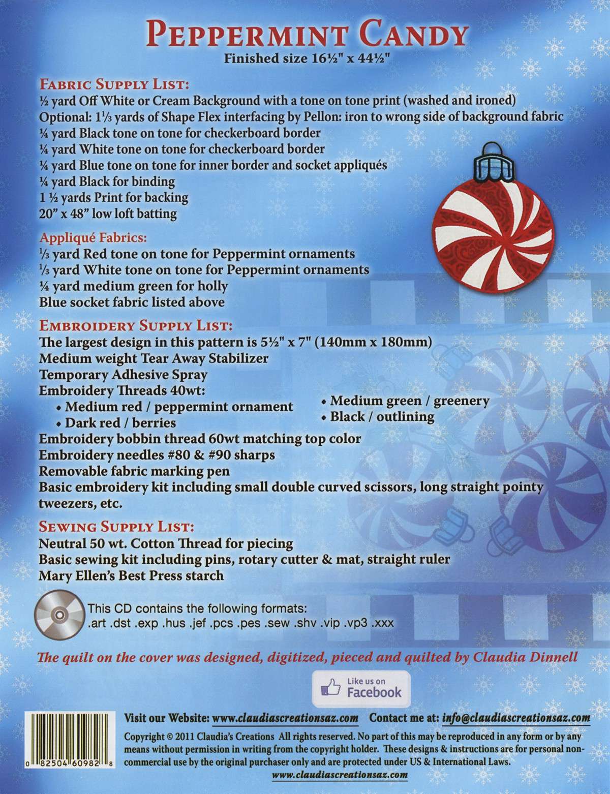 Peppermint Candy Machine Applique Designs for the Embroidery Module. The minimum required Hoop size is 5 1/2 inches x 7 inches. CD contains formats: .art .dst .hus .jef .pcs .pes .sew .shv .vip .vp3 .xxx. Finished Size: 16 1/2 inches x 44 1/2 inches.