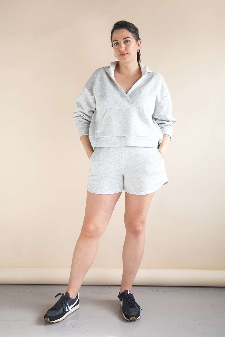 Part of our cozy yet stylish Montreal lounge collection, the Plateau Joggers are an elevated take on classic knit jogging pants. With a high rise, unique wrap around pockets and a comfy elastic waist, they are ideal loungewear at home or on the street. View A is a slim fitting pant with an optional drawstring waist and two choices of ankle finish: a fabric cuff or gathered elastic hem. View B is a pair of shorts with a gently scalloped hem. Optional back pockets can be added to either view.