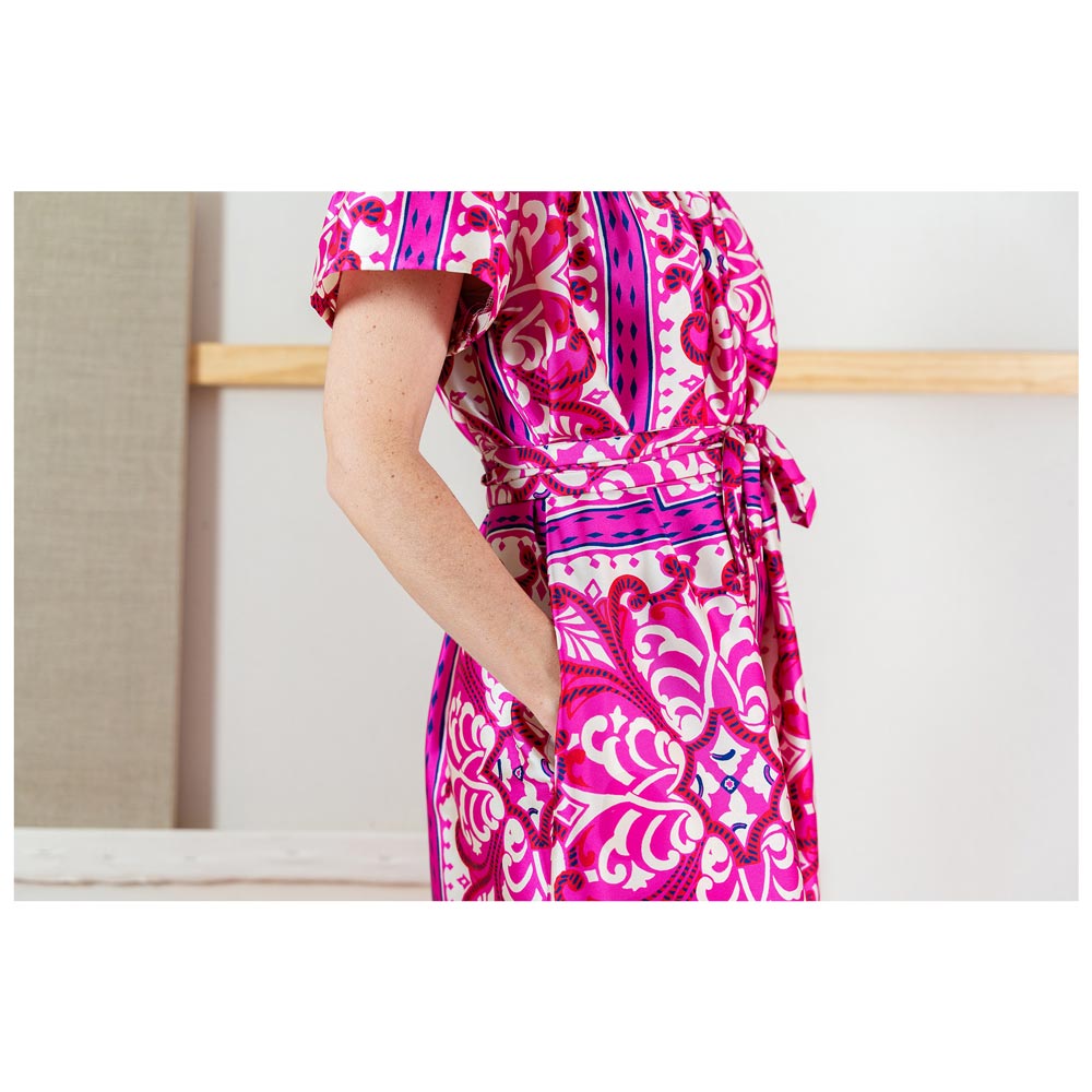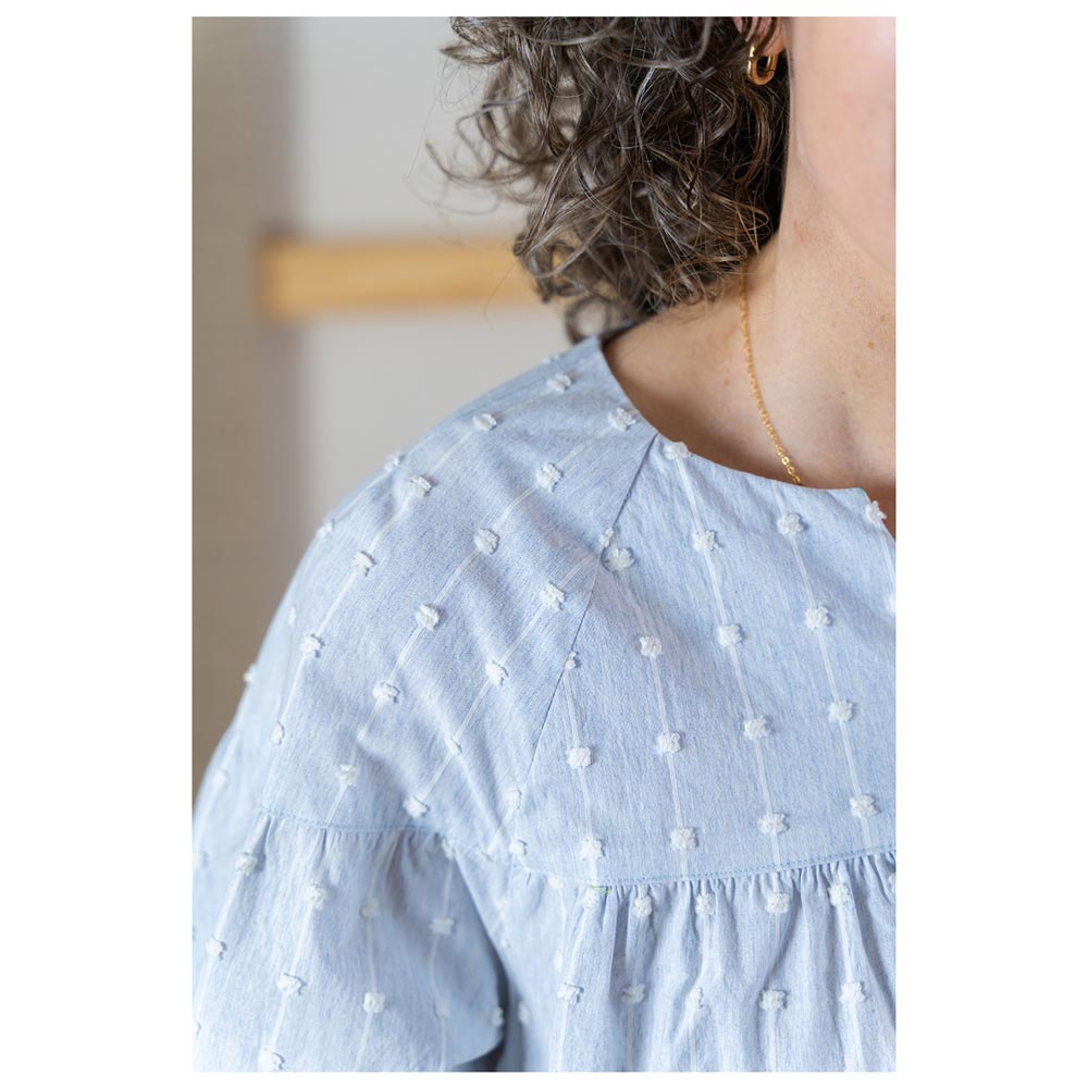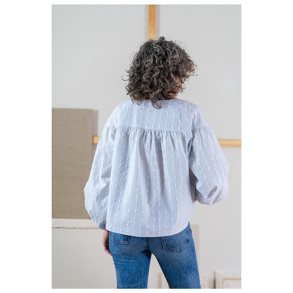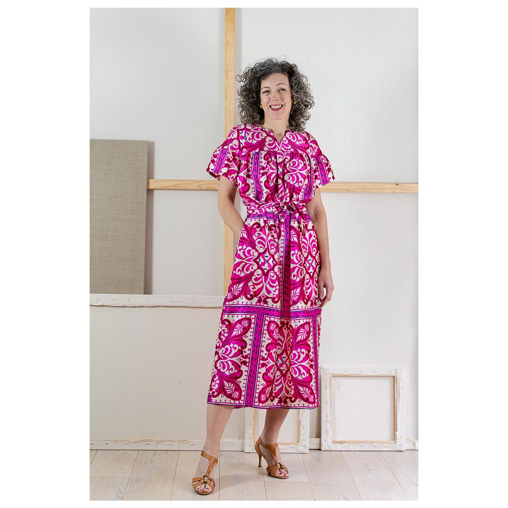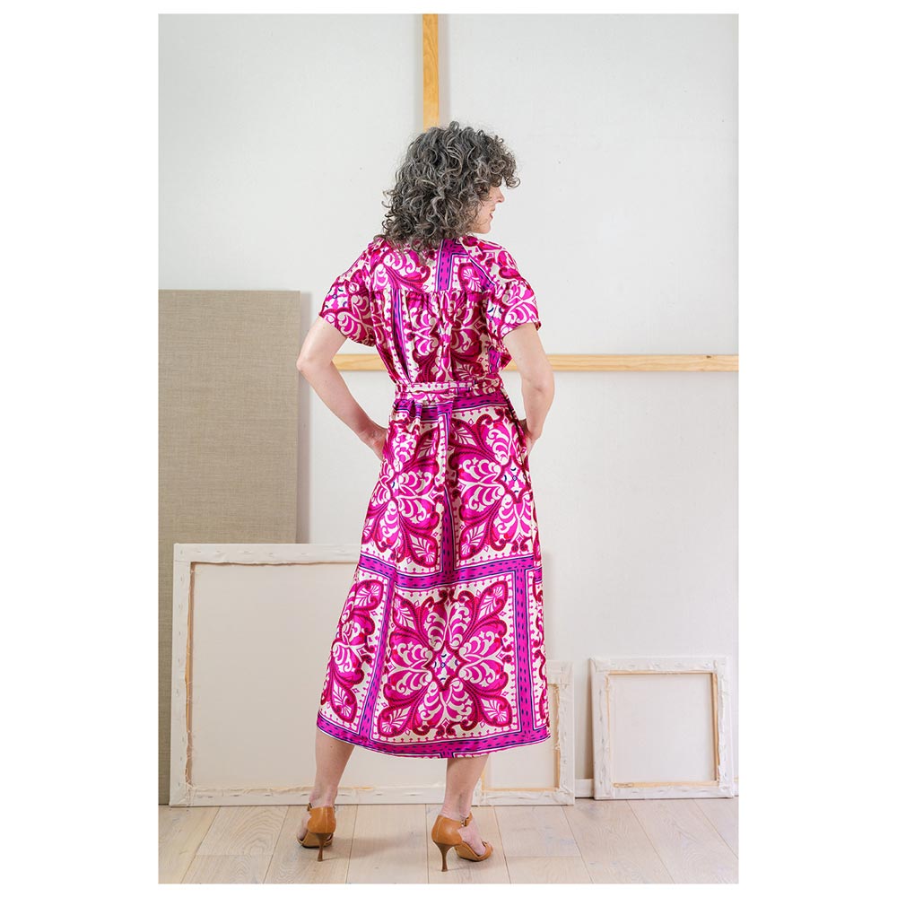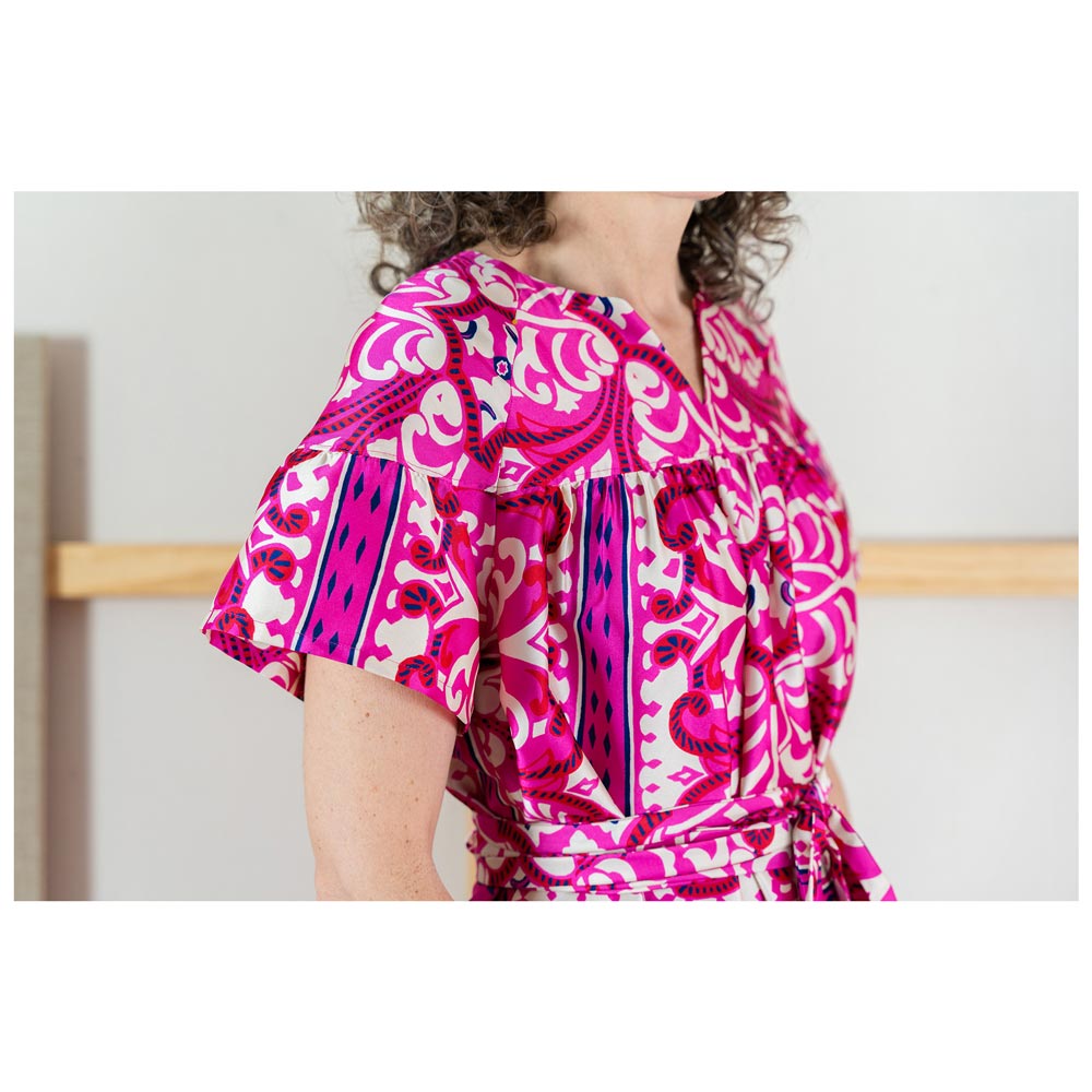 This elegant and easy-to-sew peasant blouse or dress includes full, gathered raglan sleeves with elastic at the wrists, a gentle V-neck notch, and a gathered yoke with shoulder darts for shaping. The dress includes short sleeves, side pockets, and a narrow tie that loops around the waist. You can make the tie as long as you like in order to wrap it multiple times, and you can customize this style to your preference, swapping the sleeve lengths if you prefer. This style is also suitable for embroidery or other embellishment. It can be worn as a casual blouse, draped dress, or even a swimsuit coverup. Pattern only.