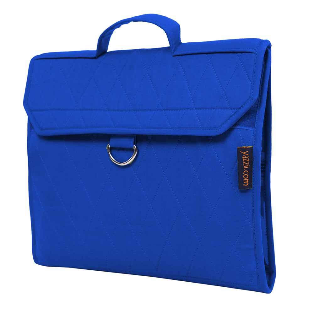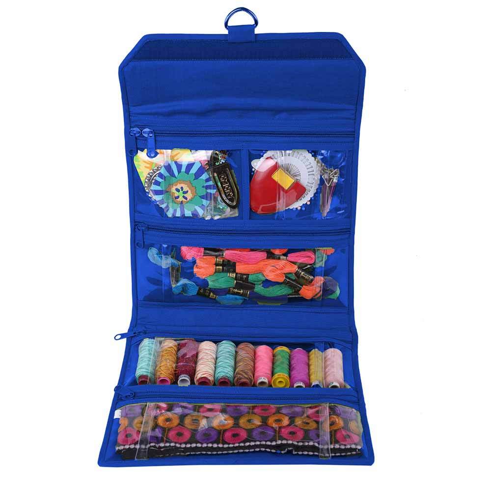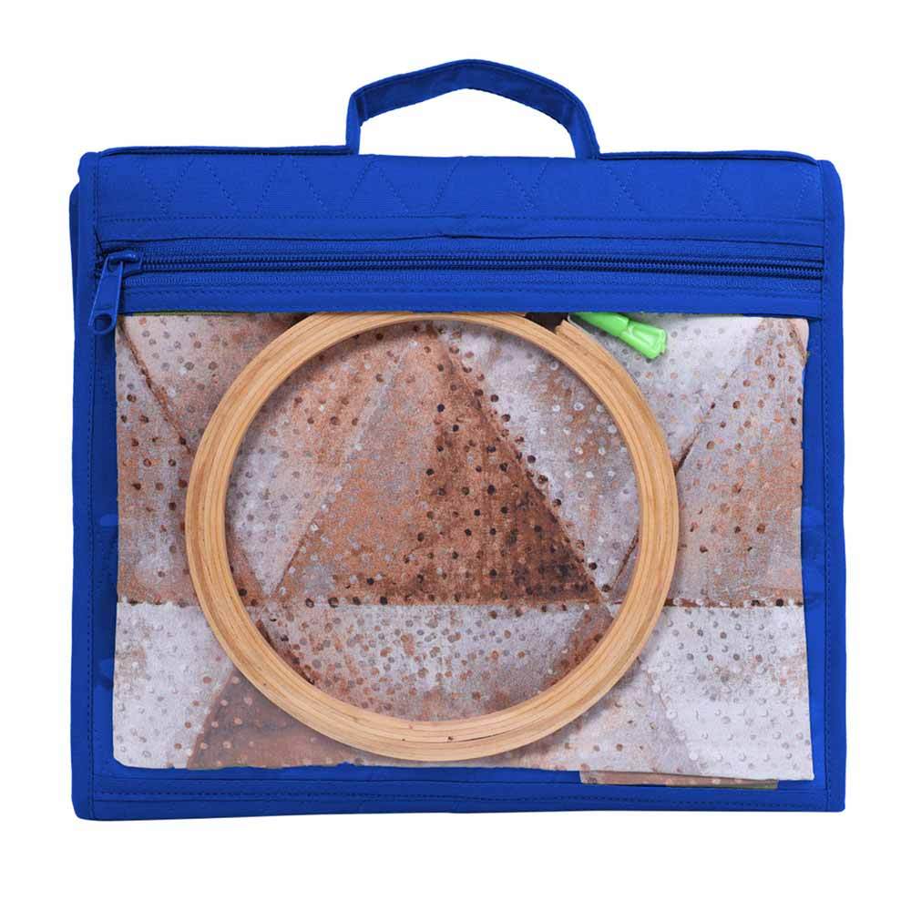 An Innovative and practical storage bag to organize your threads and carry your small projects to class, retreats and store at home. 4 horizontal see-through pockets internally and a large external pocket to store your small project. This quilted and lightweight organizer has a small handle to carry the bag or a hook to hang and display all your threads.