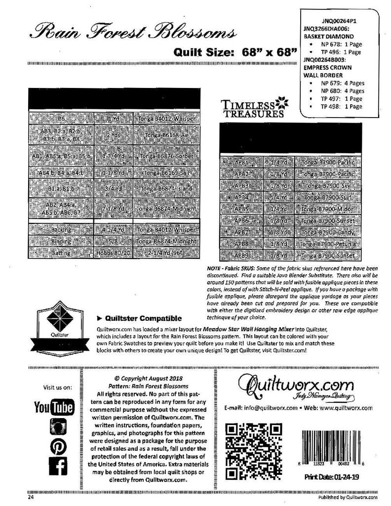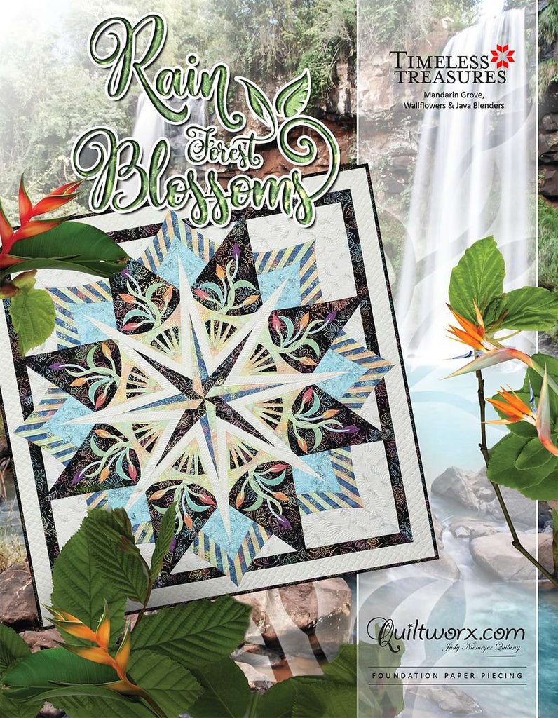 Rain Forest Blossoms is a foundation paper pieced pattern. Pattern Includes: Instructions, Cover Sheet, Yardage Information, Foundation Papers. Quiltster compatible. Finished Size: 68 inches x 68 inches. Fabric not included.