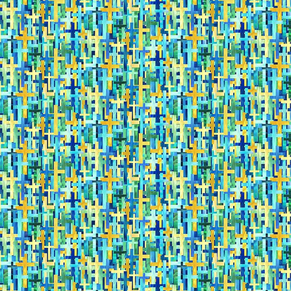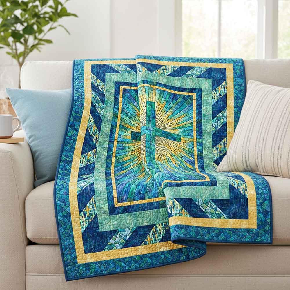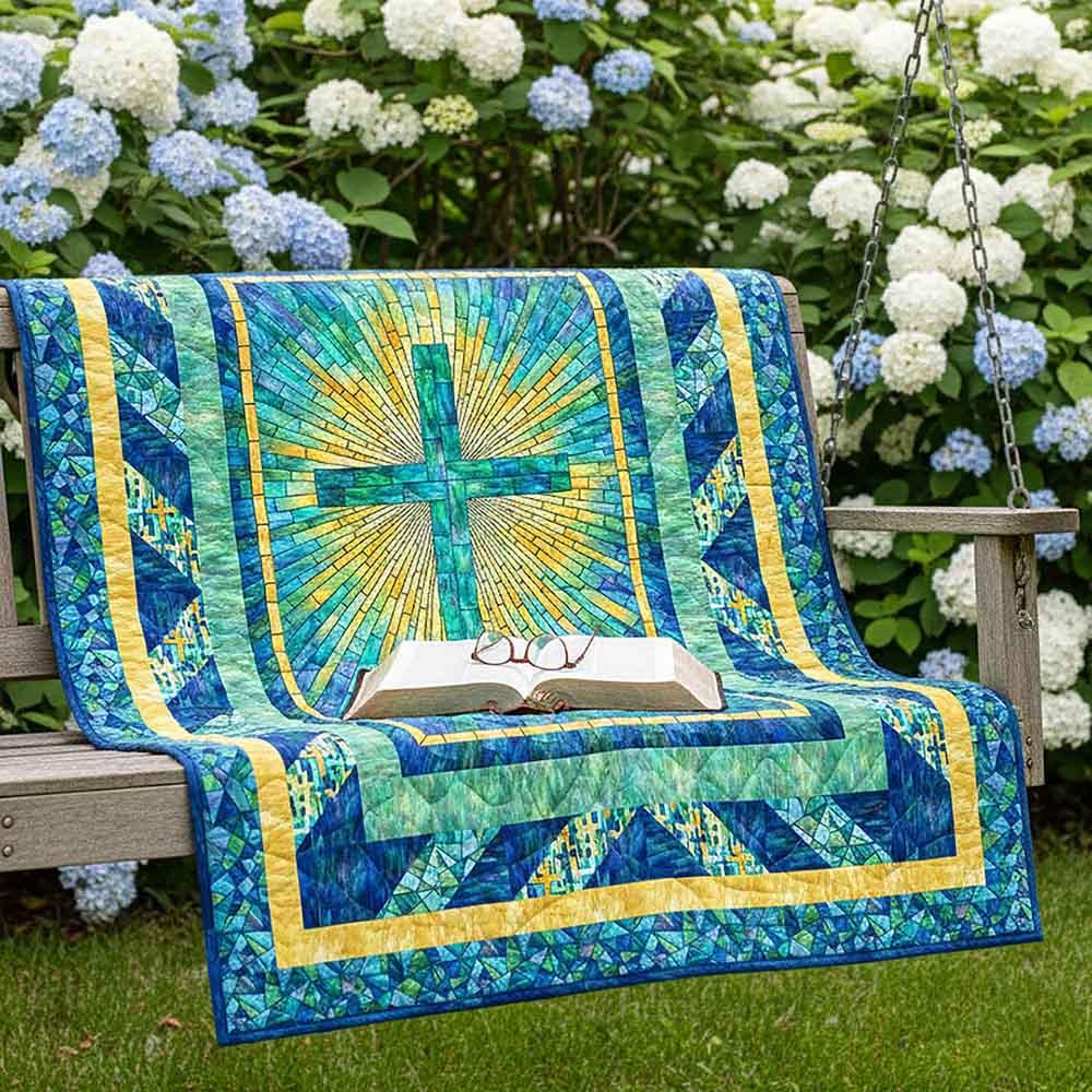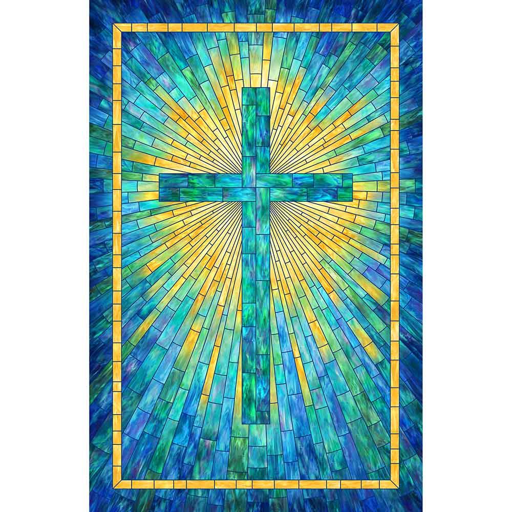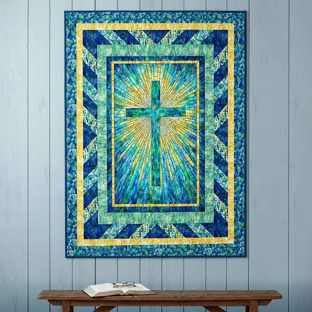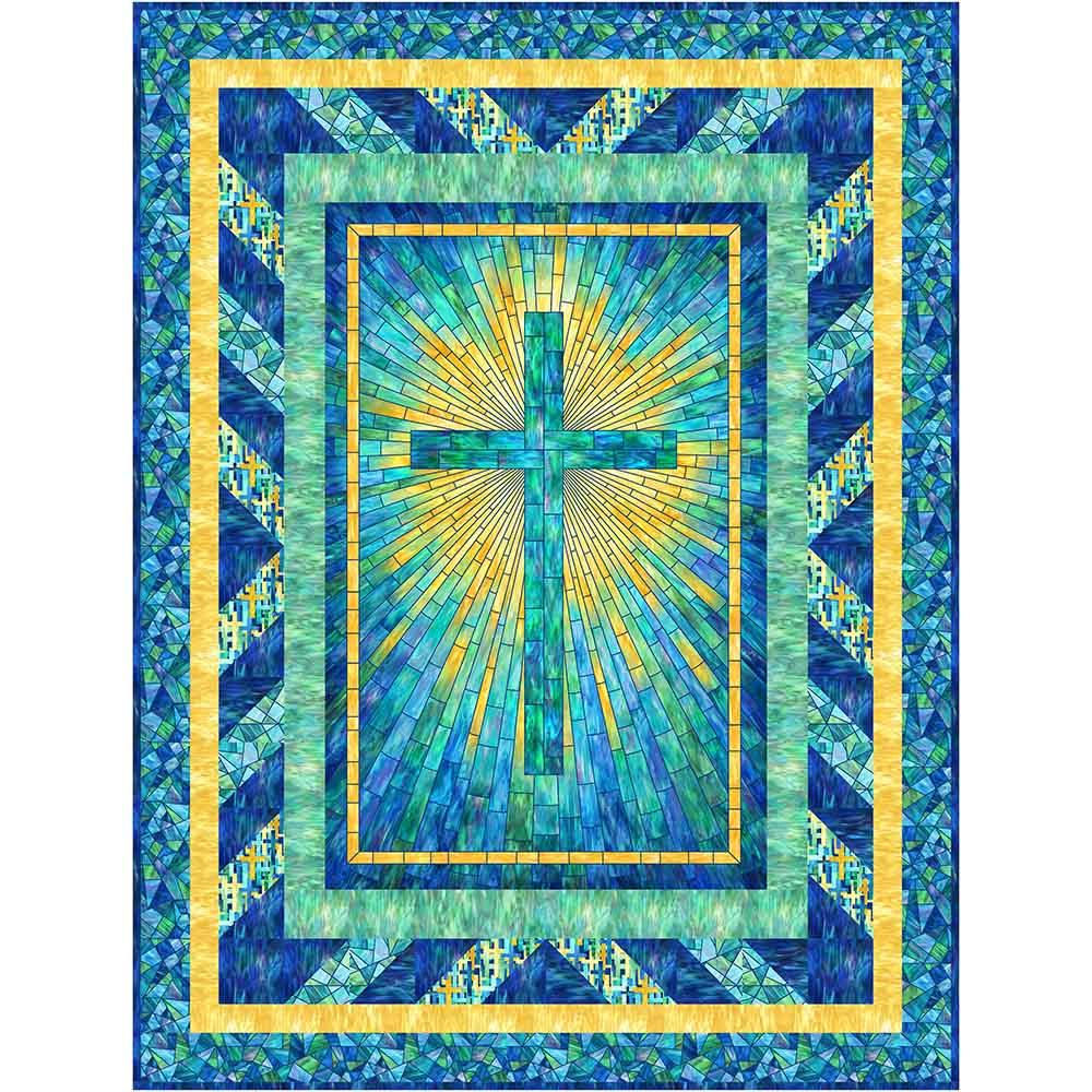 Half square triangle blocks in the middle border of this pattern repeat the "rays" that emanate from the center panel from Northcott's Risen collection. The Rays of Glory Kit includes pattern by Bound to Be Quilting and all the fabrics needed, including panel, for the top and binding of a 50" x 66" quilt. Skill level is confident beginner. Backing available separately, 4 yards x 44" wide recommended.