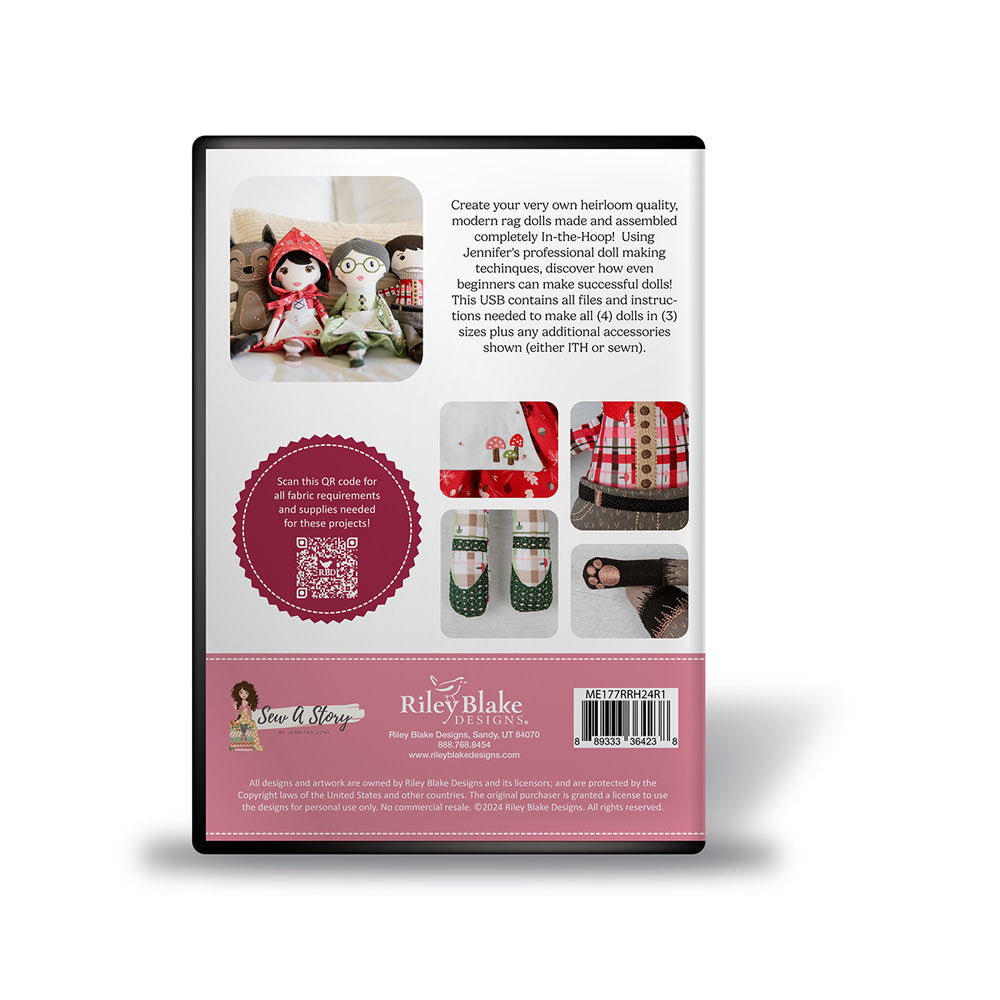 Create your very own heirloom quality, modern rag dolls made and assembled completely In-the-Hoop! Using Jennifer's professional doll making techniques, discover how even beginners and children can make successful dolls! Stitch out the characters from the Little Red Riding Hood story and inspire the next generation. This USB contains all files and instructions needed to make all (4) dolls in (3) sizes plus any additional accessories shown (either ITH or sewn).