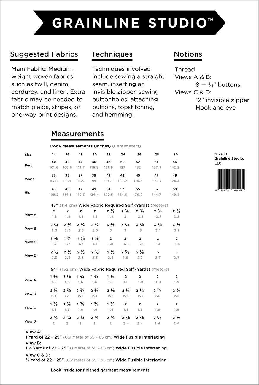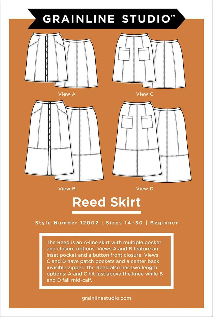 Reed is an A-Line skirt with multiple pocket and closure options. Views A and B feature an inset pocket and a button front closure. Views C and D have patch pockets and a center back invisible zipper. The Reed also has two length options: A and C hit just above the knee while B and D fall mid-calf.