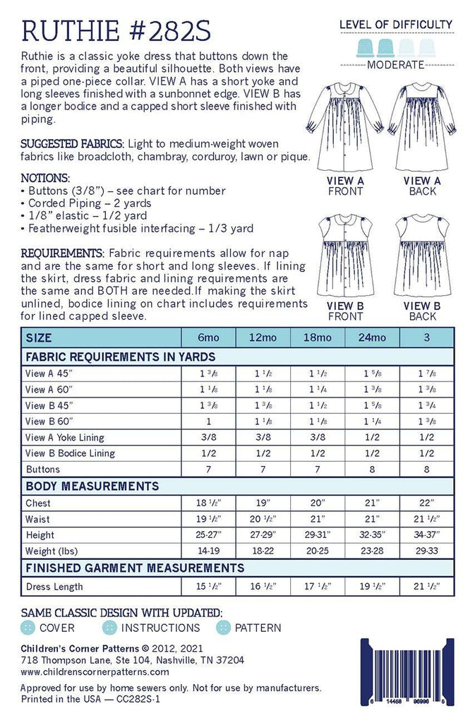 Ruthie is a classic Children's Corner yoke dress that buttons down the front, providing a beautiful silhouette. Both views have a piped one-piece collar. View A has a short yoke and long sleeves finished with a sunbonnet edge. View B has a longer yoke and a capped short sleeve finished with piping. Includes Sizes 6 months - 3. For inspiration and tutorials, visit us at www.childrenscornerstore.com