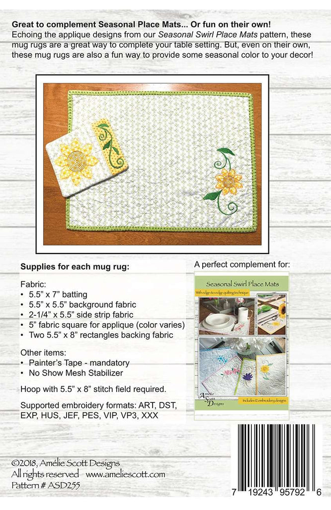 Echoing the applique designs from our Seasonal Swirl Place Mats pattern, these mug rugs are a great way to complete your table setting. But, even on their own, they are a fun way to provide some seasonal color to your decor. An embroidery hoop with a 5.5 x8 inch stitching field is required. Supported embroidery formats are ART, DST, EXP, HUS, JEF, PES, VIP, VP3, XXX .