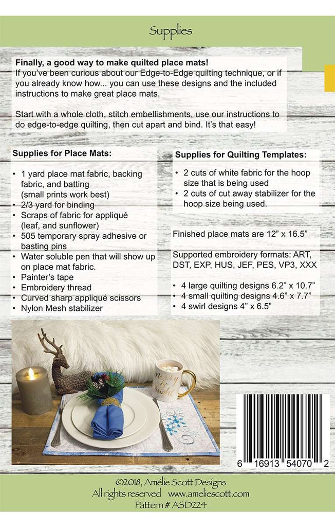 Quickly make 4 placemats at a time, using one of 4 seasonal designs that will charm and delight. This product is also an easy way to learn the basics of our Edge-to-Edge quilting technique. Includes: 4 large quilting designs 6.2 inches x 10.7 inches; 4 small quilt designs 4.6 inches x 7.7 inches; and 4 embroidery and appliqué embellishments 4 inches x 6.5 inches. Formats: ART, DST, EXP, HUS, JEF, PEC, PES, VP3, XXX. Fabric not included.
