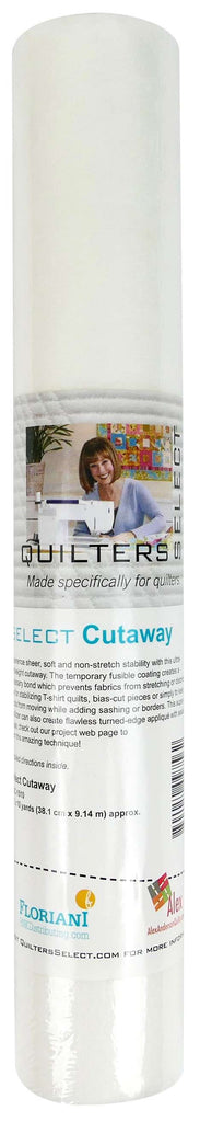 The temporary fusible coating on this sheer, soft, non-stretch cutaway creates a bond that prevents fabrics from stretching or distorting. Use for supporting t-shirt quilts, bias-cut pieces, or simply to keep blocks from moving while adding sashing or borders. For stabilizing a T-shirt quilt block: Cut Select Cutaway at least one inch larger than the T-shirt block. Place the fusible side of Select Cutaway to the wrong side of the block. Cover the Select Cutaway with a pressing cloth or piece of cotton. Press using a medium iron temperature (wool). Square the block by trimming away the excess Cutaway. For stabilizing embroidery on knit: Cut Select Cutaway at least one inch larger than the size of the embroidery frame intended for use. Place the fusible side of Select Cutaway to the wrong side of the fabric or garment. *If the design is dense or large, place a second layer at a 45 degree angle, directly over the first piece. Cover the Select Cutaway with a pressing cloth or piece of cotton. Press using a medium iron temperature (wool). Place the now stabilized fabric within the hoop and stitch. Once the embroidery is complete, pull the stabilizer back to the design and trim away the excess. It may be necessary to reheat the stabilizer in order for it to release from the fabric. * Non-Woven * Fusible * Single Sided * Weight: Midweight * Washing/Drying Instructions: Cool water and low drying temperature recommended. Press using a low to medium setting on your iron and press cloth. Do not touch the iron directly to the stabilizer.