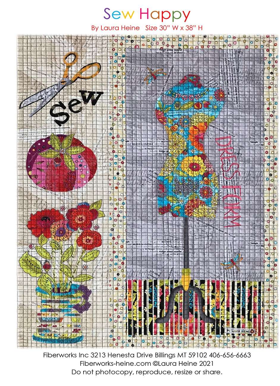 Sew Happy Collage Pattern by Laura Heine. This beautiful collage is used with Laura Heine's new fabric line for Windham Fabrics "Happy Chance" will be available October 2021. Laura uses her new Dress Form panel for this pattern out of her "Happy Chance" fabric line. This pattern includes step by step collage instructions with colored photos. Finished size 30in x 38in.