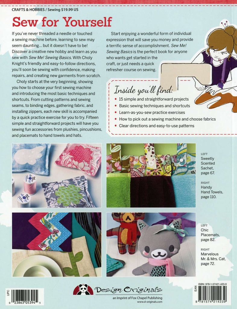 Sew Me! Sewing Basics is geared towards would-be sewers of all ages, who may never have touched a sewing machine or even threaded a needle before. It’s the perfect book for anyone who wants to get started in the craft, or just needs a quick refresher course in sewing. Choly Knight’s friendly and easy-to-follow directions will get readers sewing with confidence, making repairs, and creating new garments from scratch. She starts at the very beginning, showing how to choose a sewing machine and introducing the most basic techniques and shortcuts. From cutting patterns and sewing seams, to binding edges, gathering fabric and installing zippers, each new skill is accompanied by a quick practice exercise to try, allowing readers to learn as they sew. 36 simple and straightforward projects are provided for sewing fun accessories from plushies, pincushions and placemats to hand towels and hats.