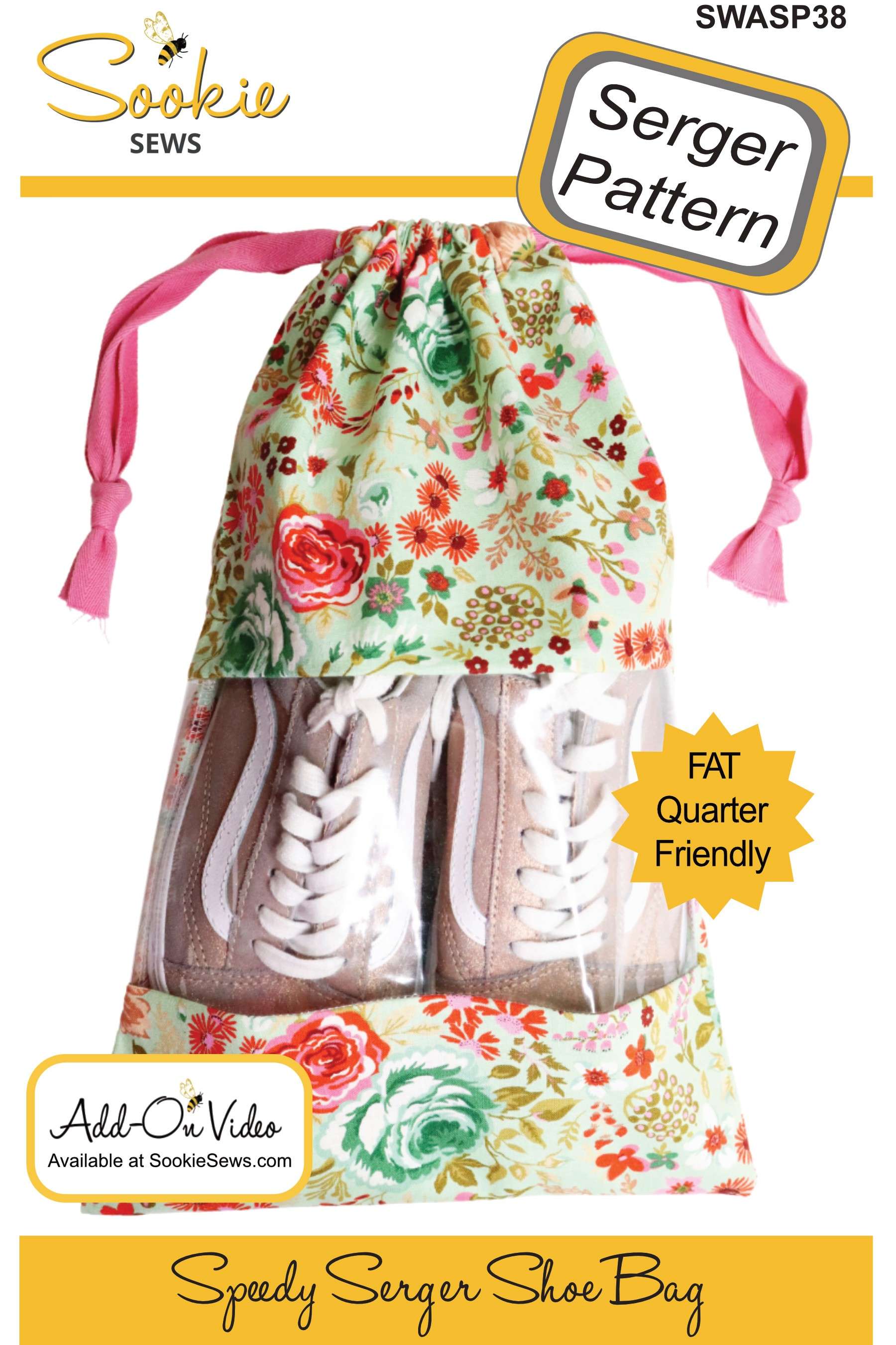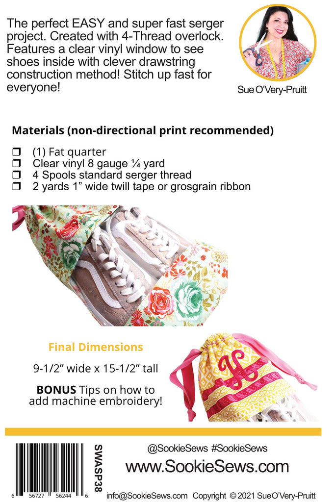 This is a great beginner serger project and is fat quarter friendly. Whip up one for every member of your family and for every pair of shoes in no time. You will discover that because of the see thru clear vinyl window, you can store more than only shoes in this serger bag. Think of how you can organize your sewing space, bathroom cabinets, and more. This shoe bag is made entirely on a serger. Use a 4-Thread overlock from beginning to end, learn how to serge with clear vinyl, discover a clever way of adding the drawstring casing, and see tips on adding machine embroidery. Finished bag measures 9-1/2in wide x 15-1/2in tall.