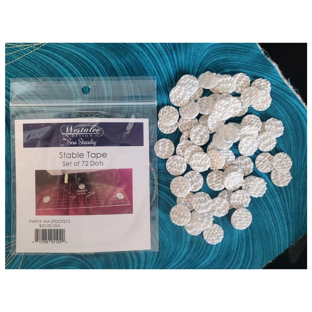 This product is one of those little add-ons that enhance and add ease to your ruler work experience! Stable Tape is a self adhesive tape to help keep rulers and templates in place which grips to the fabric, but does not stick to it! Great for both domestic and longarm users. The new and improved Stable Dots are ½ inch diameter.