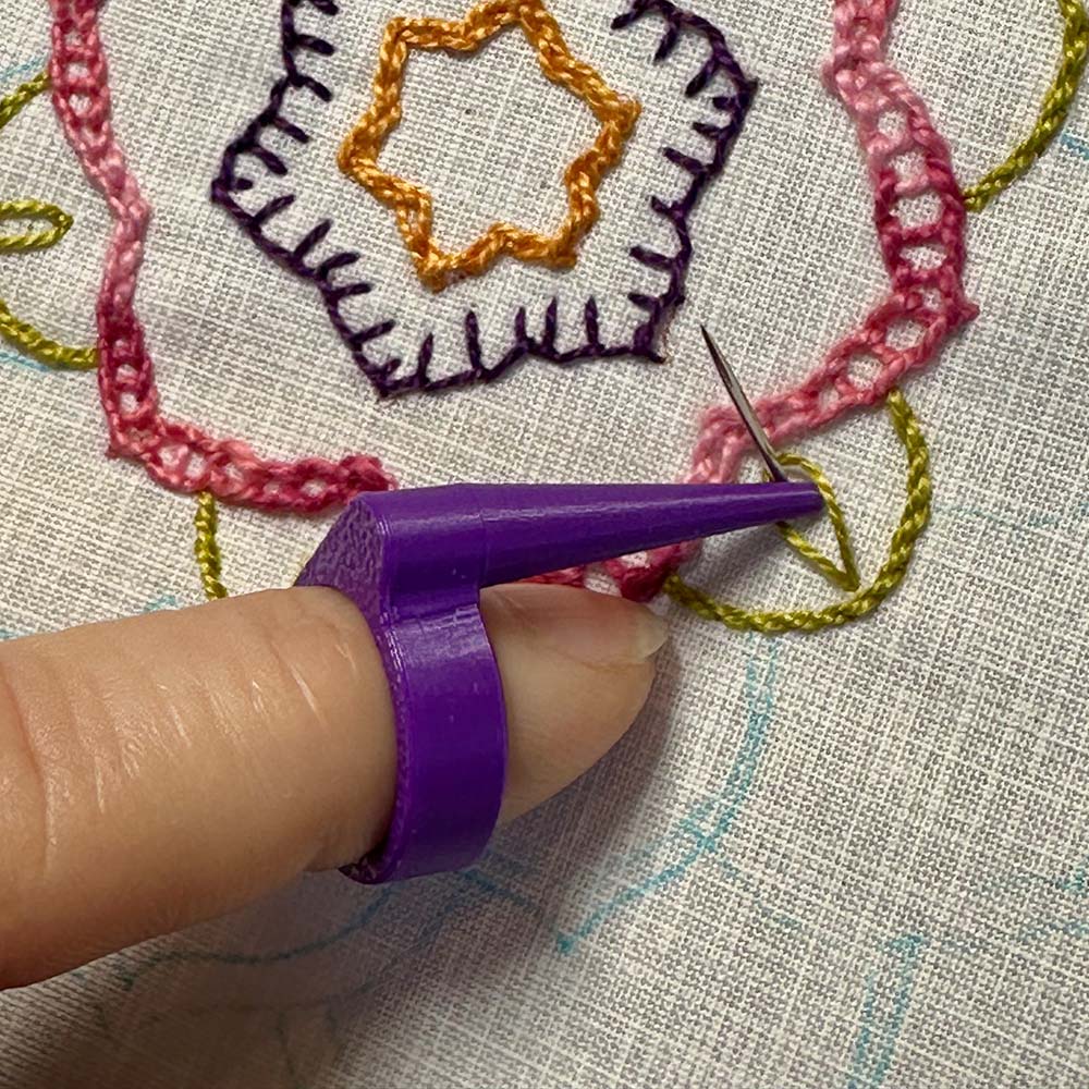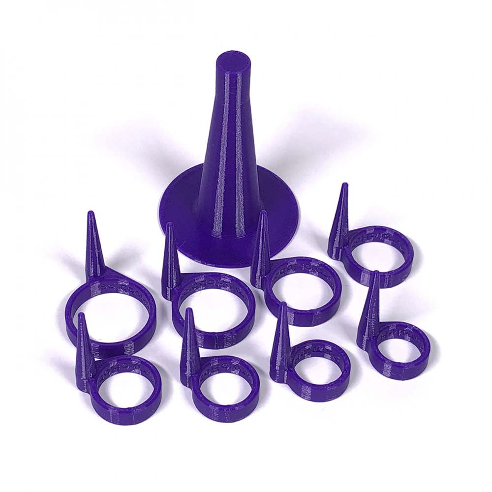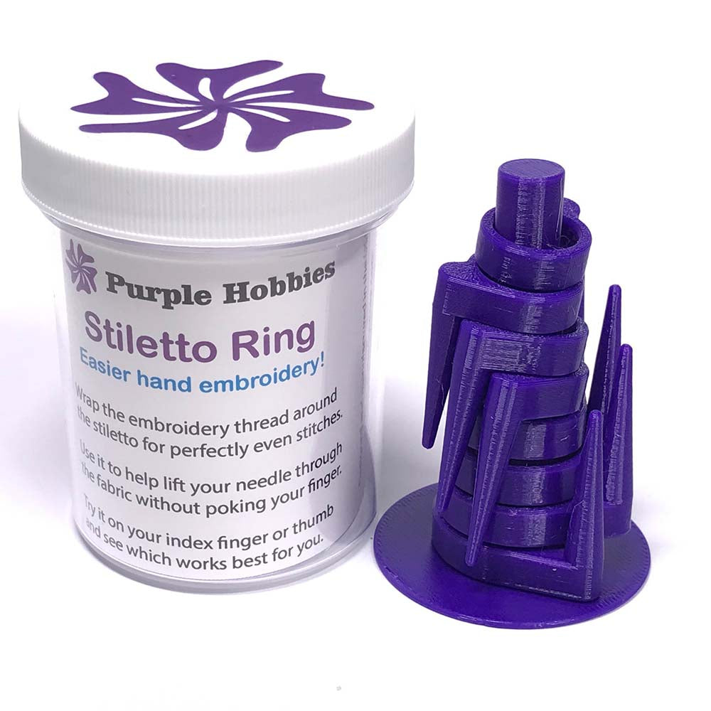 Make hand embroidery easier and more consistent with stiletto rings. The set includes 8 different sizes of rings so you can choose the perfect fit. Try them on different fingers to see which is more comfortable for you. The sizes are marked inside each ring so you can order more of a specific size if desired. Includes a stand to hold all the rings in order and a clear plastic jar to store them.
