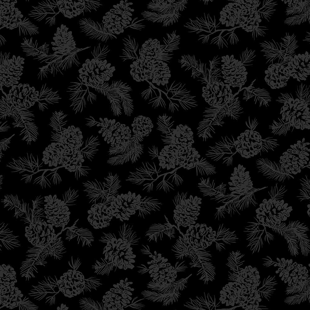 Spruce 108" is the perfect backing for all your cozy winter quilts. Pine branches spread across the fabric, capturing the essence of nature's beauty. The pinecones upon their branches add a touch of rustic charm and depth to the design. This is the perfect choice for someone who loves nature and wants to bring that into their next winter project. Spruce is available in evergreen, silver, pale yellow and black.
