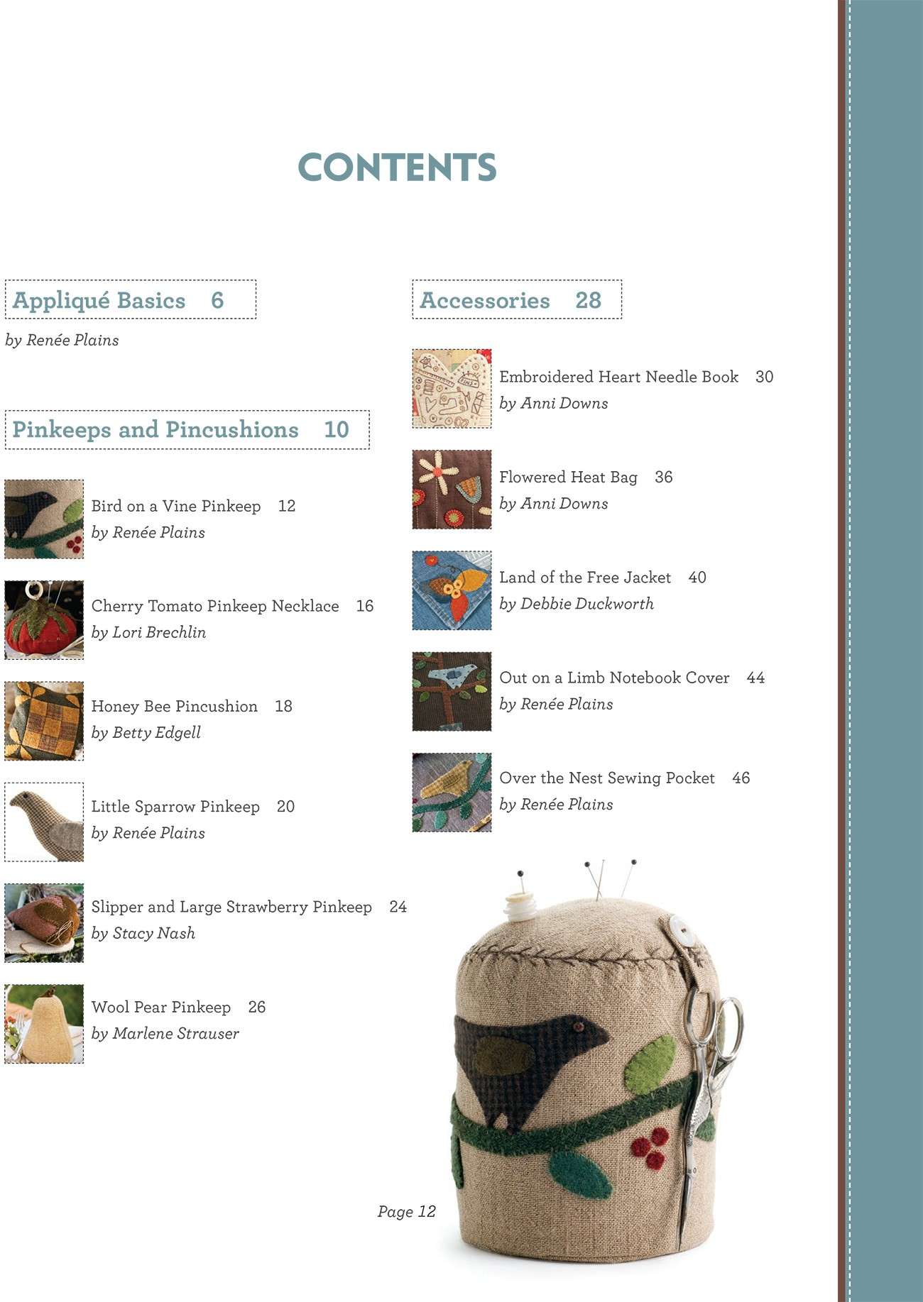 From traditional penny rugs to playful embellishments on a contemporary blue jean jacket, this delightful book offers something for everyone, whether you want to try wool applique for the first time (how about the darling little Cherry Tomato Pin keep Necklace?) or you're an experienced wool fanatic (get instructions for a beautiful wall hanging-size quilt!). Projects include everything from table mats, runners, pin keeps, and pincushions to pillows, a needle book, a notebook cover, and more, all in the popular folk art style.