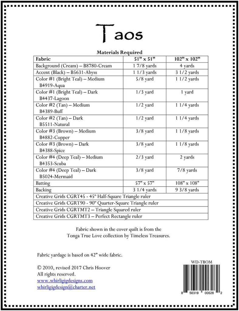 Taos quilt pattern includes 2 sizes of quilts and requires the following Creative Grids rulers for construction: 45 degree Half Square Triangle (Part D# CGRT45), 90 degree Quarter Square Triangle (Part # CGRT90), Triangle Squared (Part # CGRTMT2), and Perfect Rectangle (Part #C CGRTMT3). Finished Sizes: 51 inches x 51 inches and 102 inches x 102 inches. Fabric not included.