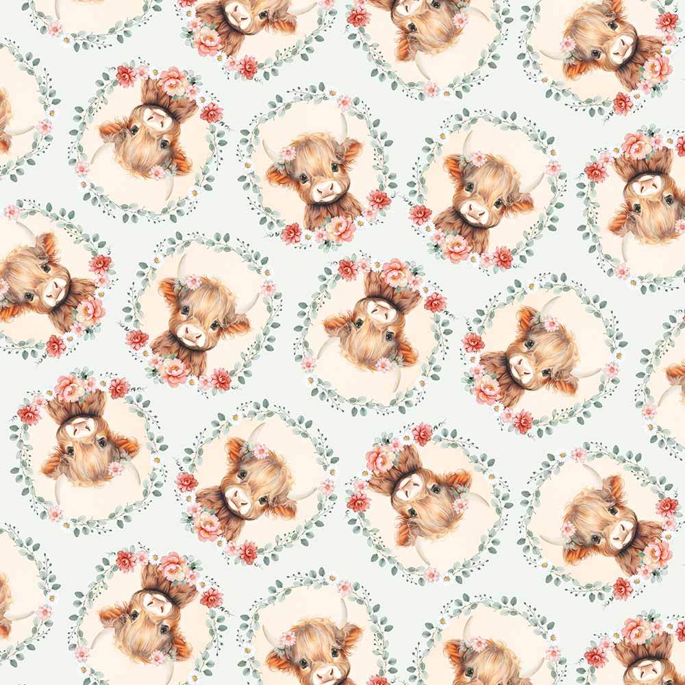 The sweetest cows framed with florals are featured in the Tossed Cow Heads & Floral print in Sky from the Til The Cows Come Home collection by Timeless Treasures.