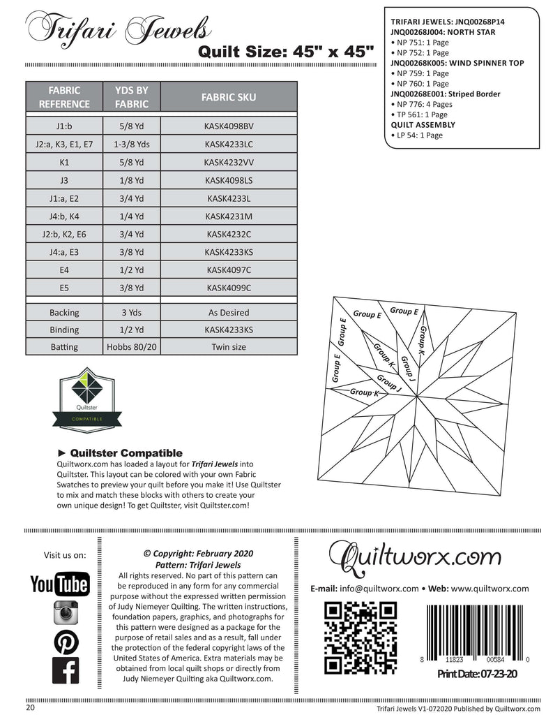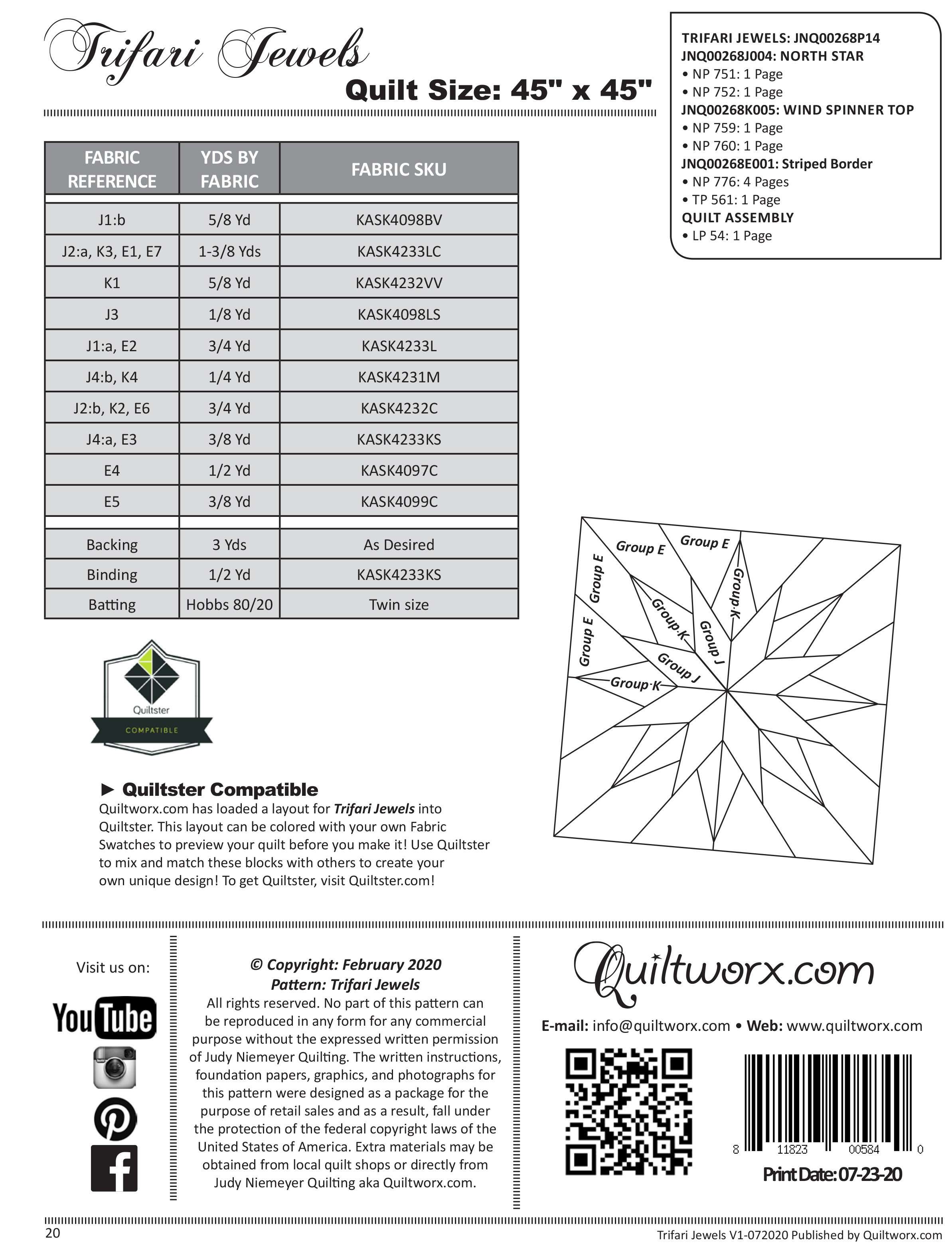 Trifari Jewels is constructed using three sections Group J i s comprised of 8 center diamonds, Group K radiates out from the center star in an additional round of 8 star points, an d Group E is a pieced border added to the rounds to result i n a 45 square quilt.