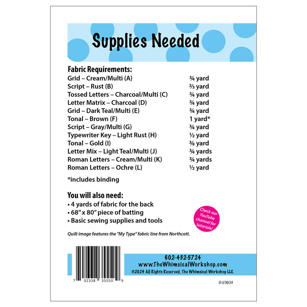 60" x 72" Advanced Beginner, Pieced project featuring the My Type fabric line from Northcott Fabrics. Pattern only.