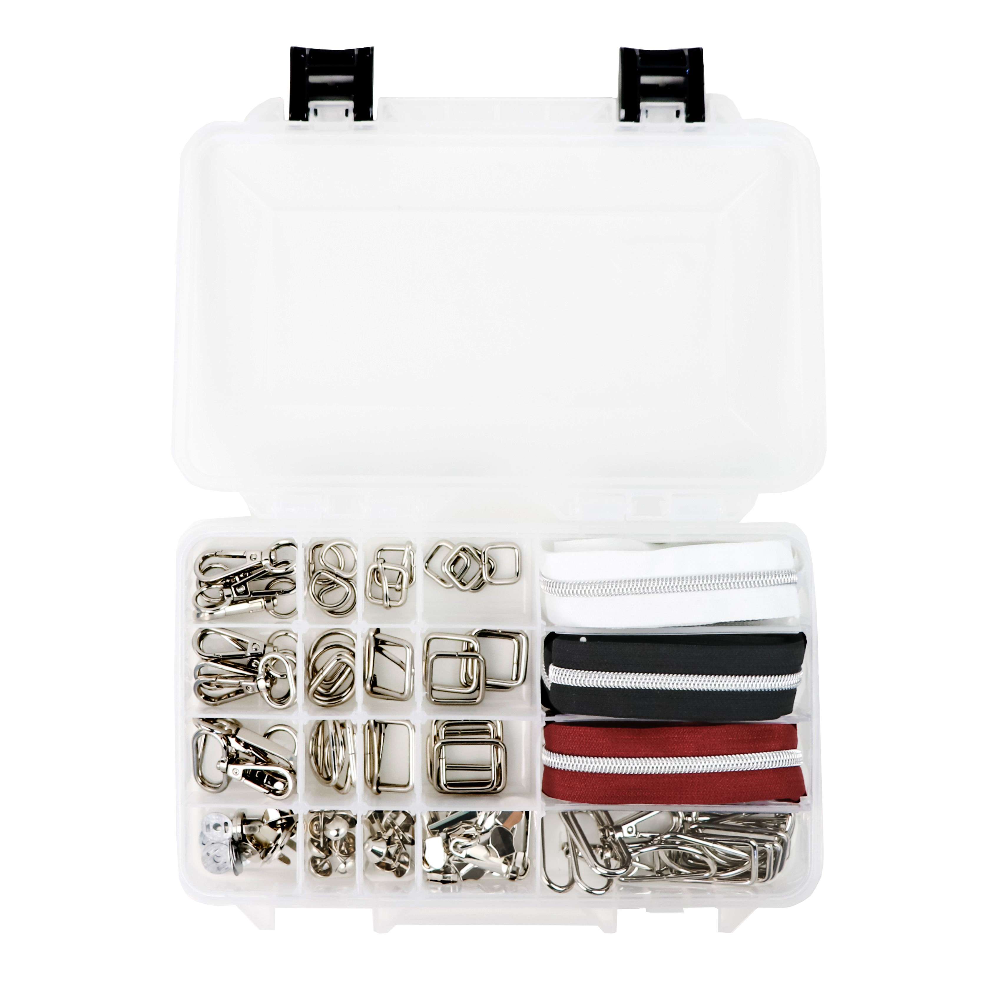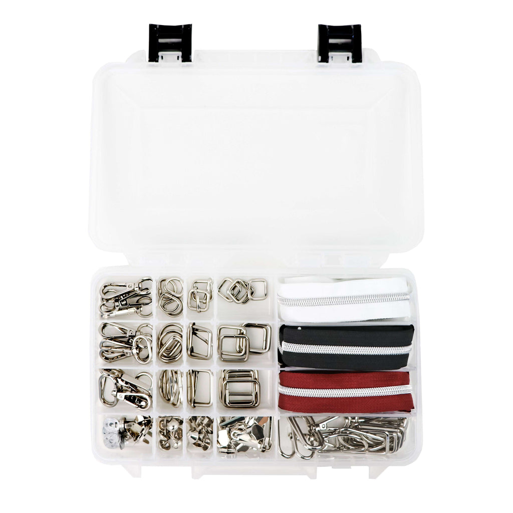 Are you tired of not having the hardware you need for bag making on hand? In an effort to help elimate that frustration, we've put together an organized box set of essential purse hardware! That way, you can spend less time searching for hardware and more time creating! Our Ultimate Box Bundle of Essential Hardware and Zippers comes in five finishes, nickel, gold, antique, gunmetal, and rose gold. Choose the boxed set with the color you use the most, or get multiple boxes to grow your stash of bling!