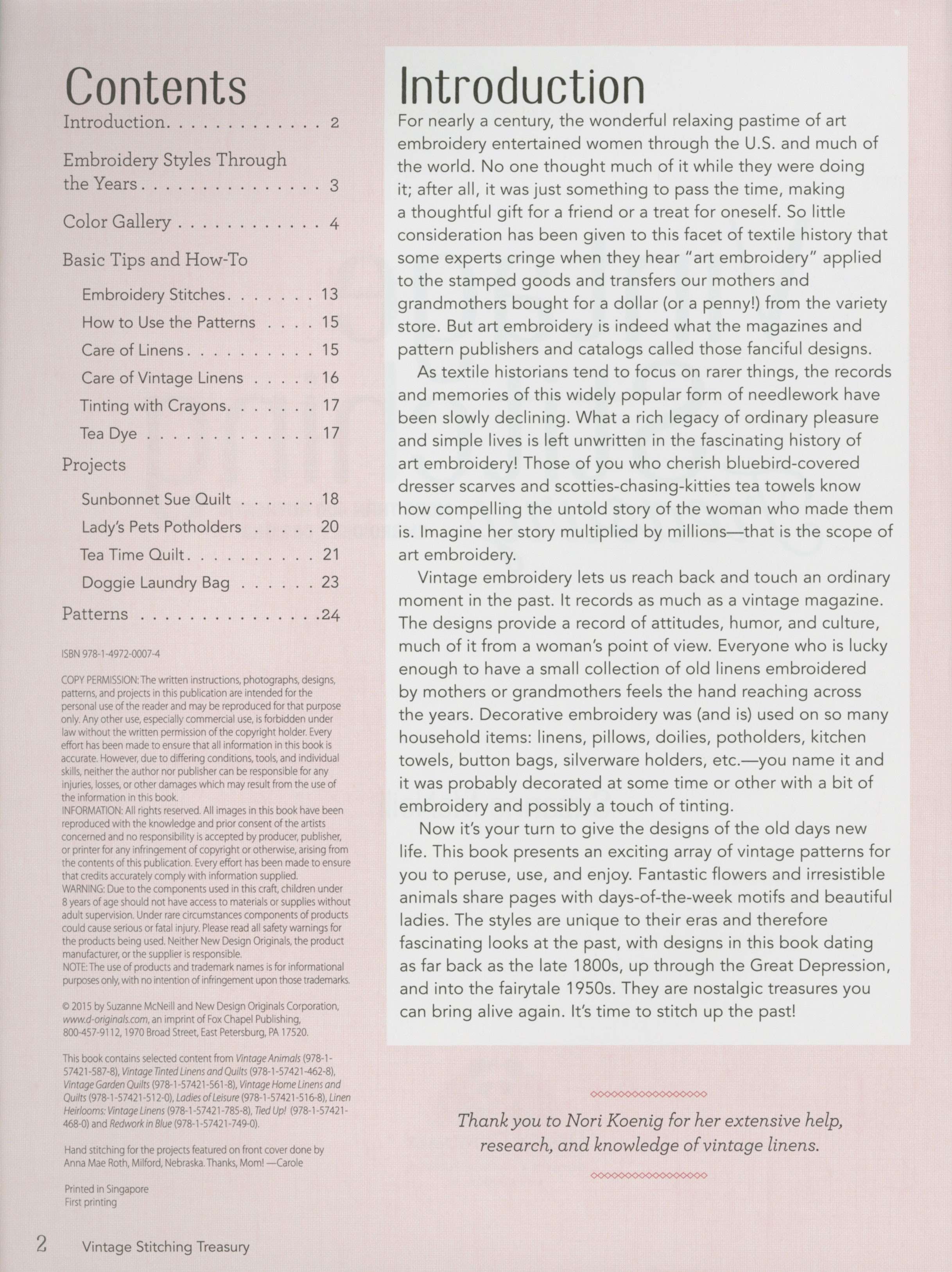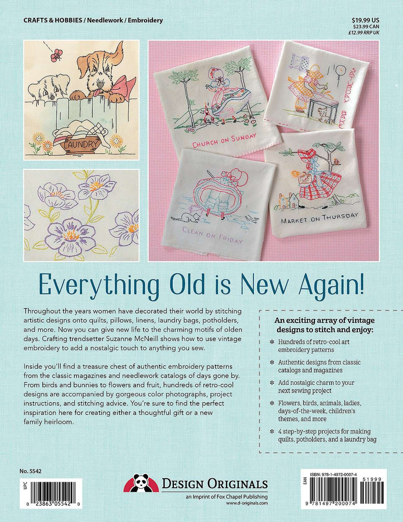 (11" x 8.5" 128 pages) Crafting trendsetter Suzanne McNeill shows how to use vintage embroidery to add a nostalgic touch to anything you sew. Throughout the years women have decorated their world by stitching artistic designs onto quilts, pillows, linens, laundry bags, potholders, and more. Now you can give new life to these charming motifs of olden days. Inside this book you’ll discover a treasure chest of authentic embroidery patterns from the classic magazines and needlework catalogs of days gone by. From birds and bunnies to flowers and fruit, hundreds of retro-cool designs are accompanied by gorgeous color photographs, stitching advice, and four step-by-step projects. You’re sure to find the perfect inspiration here for creating either a thoughtful gift or a new family heirloom.