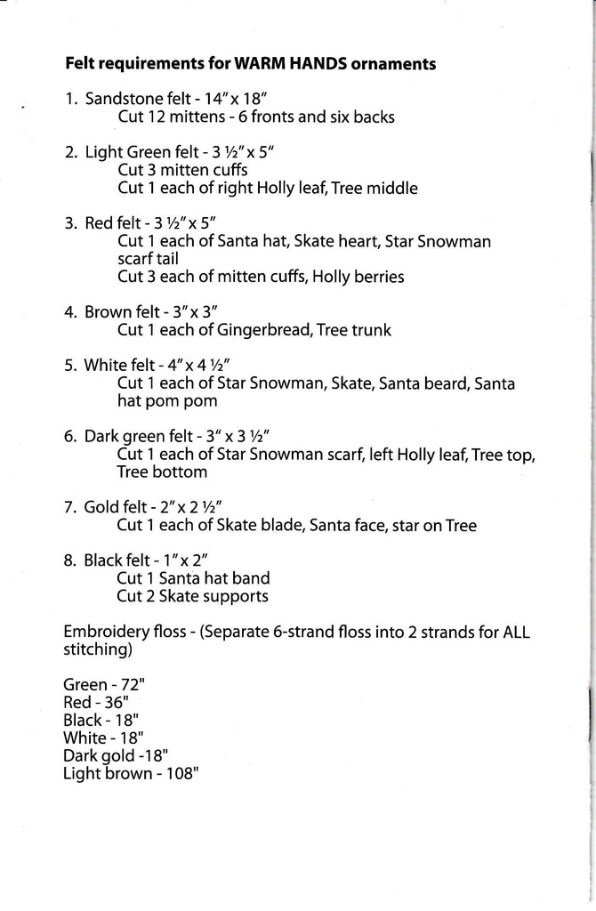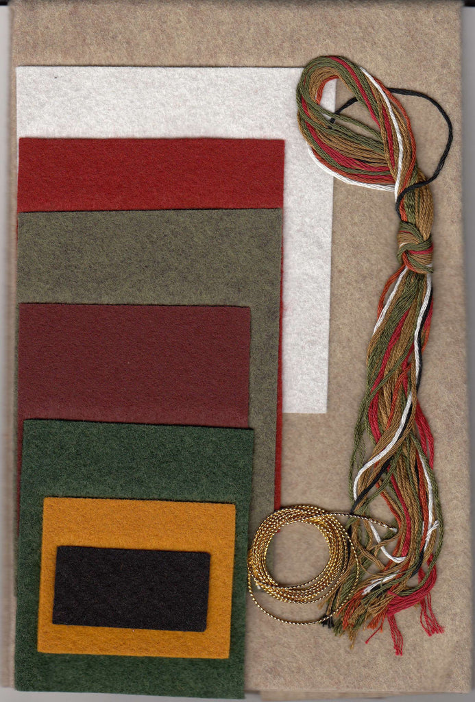 Warm wooly mittens keep hands toasty and hearts happy on cold wintry days. Kit includes woolfelt, embroidery floss, gold string plus precise patterns and illustrated instructions to make 6 mittens. Colors are sandstone, red, green, gold, brown, and white. Each mitten is approximately 4 inches x 4 1/2 inches.