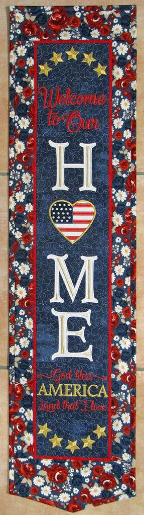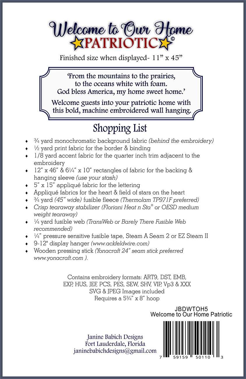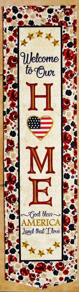 From the mountains to the prairies, to the oceans white with foam, God Bless America, my home sweet home.' Welcome guests into your patriotic home with this bold, machine embroidered wall hanging; displayed on an entry door or in a foyer, this wall hanging will show your love of our great country. This pattern also includes a 'Welcome to My' home design for solo home owners. Includes embroidery formats: ART9, DST, EMB, EXP, HUS, JEF, PCS, PES, SEW, SHV, VP3 & XXX. SVG & Jpeg images included. Minimum hoop requirement- 5 3/4" x 8" hoop.