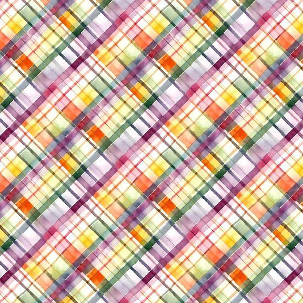 The Dahlia Botanica 108" wide Plaid print in Multi is designed by Nancy Mink for Wilmington Prints and features a diagonal plaid in a watercolor style finish.