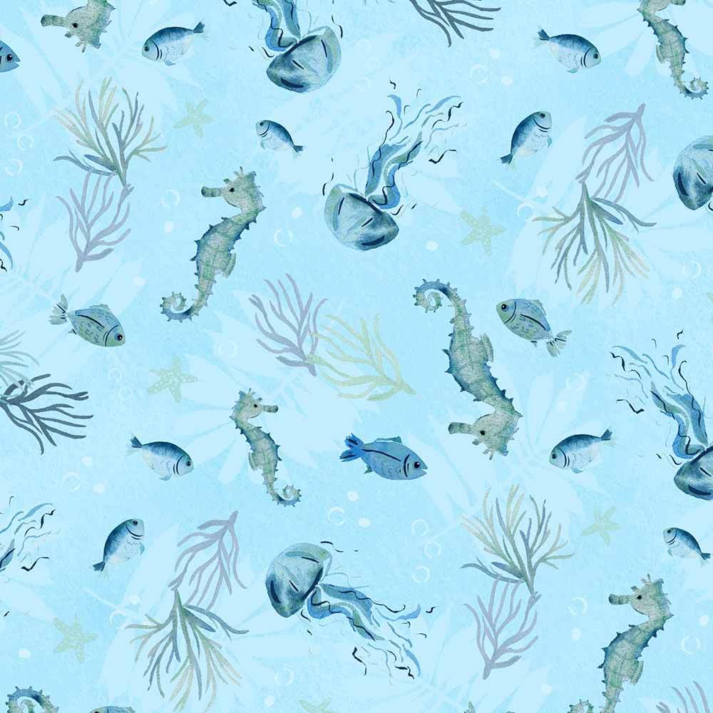 Underwater Wonders by Deane Beesley is a lively collection of ocean-inspired prints from Wilmington Prints. Featuring seahorses, jellyfish, seashells, and coral motifs across calming hues of light aqua, teal, navy, and green-blue.
