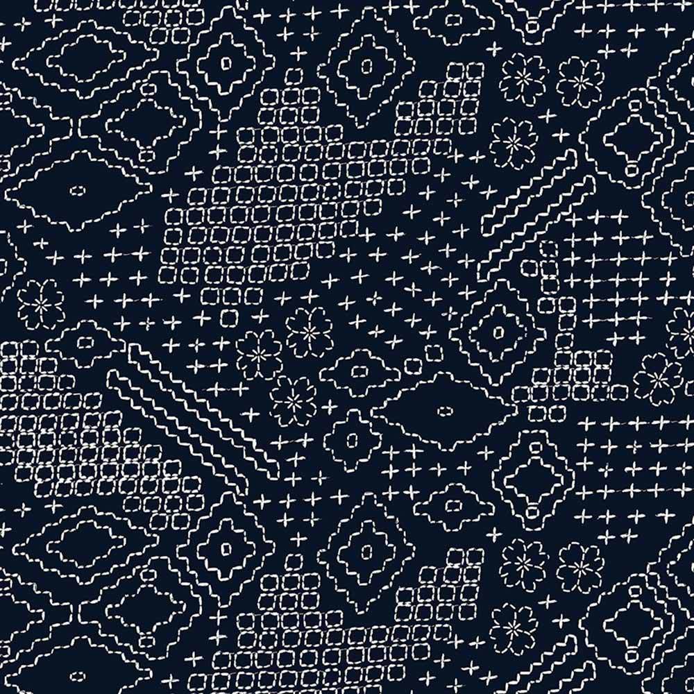 A deep navy with white stitch-like designs is featured in the Sashiko Sampler 108" wide from Windham Fabrics. Precut to 108" x 108" - our exclusive 3 yard back pack.