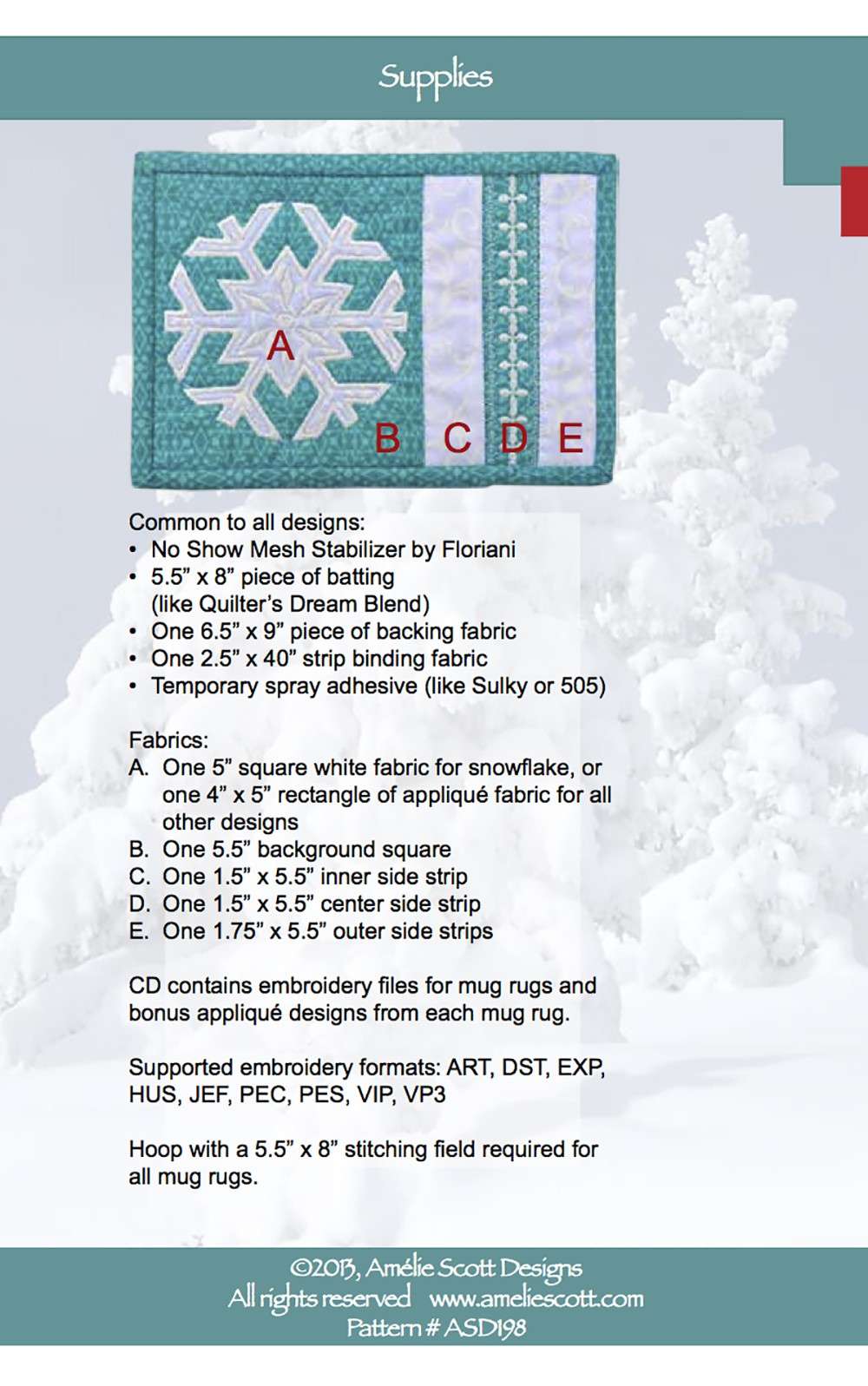Winter Mug Rugs pattern includes snowflake, snowman, hot cocoa, and mittens designs. The pattern includes digital embroidery files for all major machines, step-by-step instructions with photographs, and bonus applique designs that you can use on other projects. Hoop with a 5-1/2 inch x 8 inch stitching field required for all mug rugs. Supported Embroidery Formats: art, dst, exp, hus, jef, pec, pes vip, vps. Fabric not included.