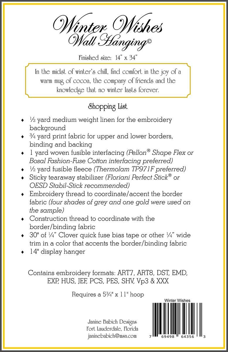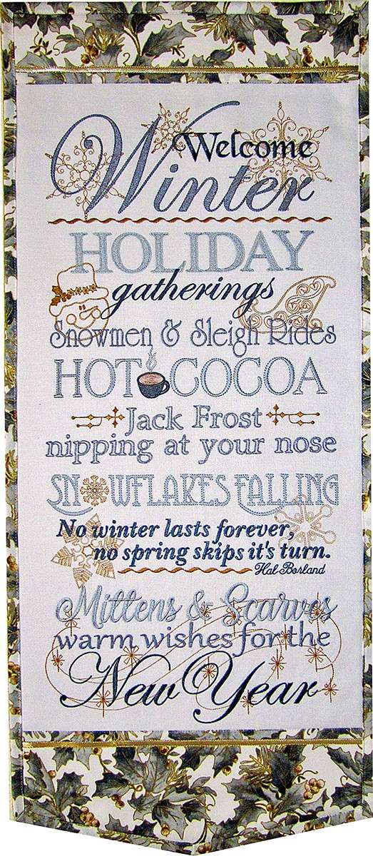 Craft a beautiful wall hanging that celebrates everything that we love about this chilly season. Family gatherings, frosty noses, warm cocoa and the joy & hope for the New Year. Requires a 5-3/4 inch x 11 inch hoop. Embroidery formats included: ART8, DST, EMD, EXP, HUS, JEF, PCS, PES, SHV, VP3 & XXX. Finished size: 14 inches x 34 inches. Fabric not included.