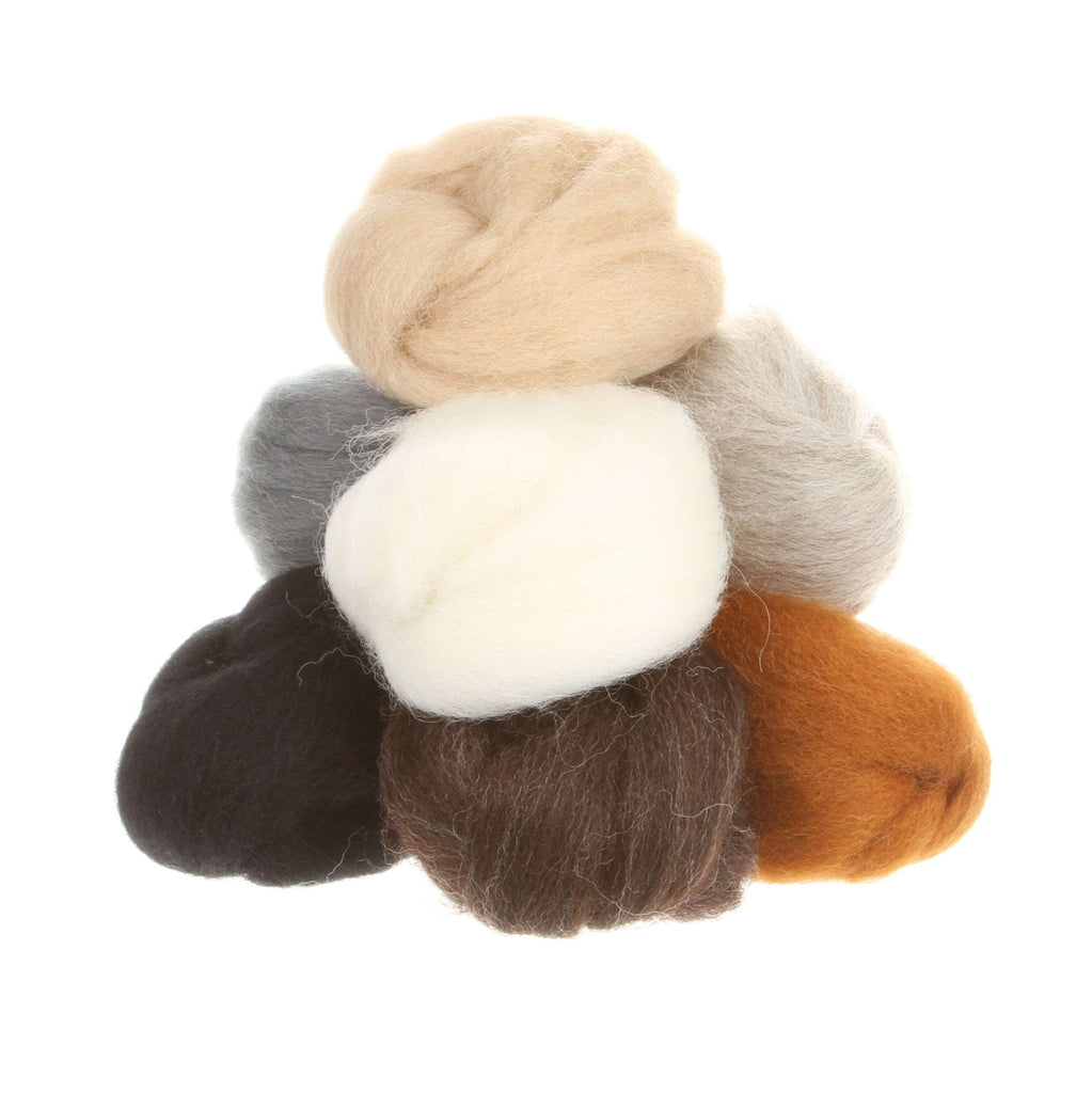This is 100% Corriedale wool roving(sliver). Excellent for needle felting, spinning, wet felting, jewelry making, 3-D sculpture or any other art work you need wonderful wool to use. 8 colors, each piece is 12in. Light Grey, Medium Grey, Dark Grey, Smoke, Black, Natural, Camel & Toffee. Great assortment for animals.