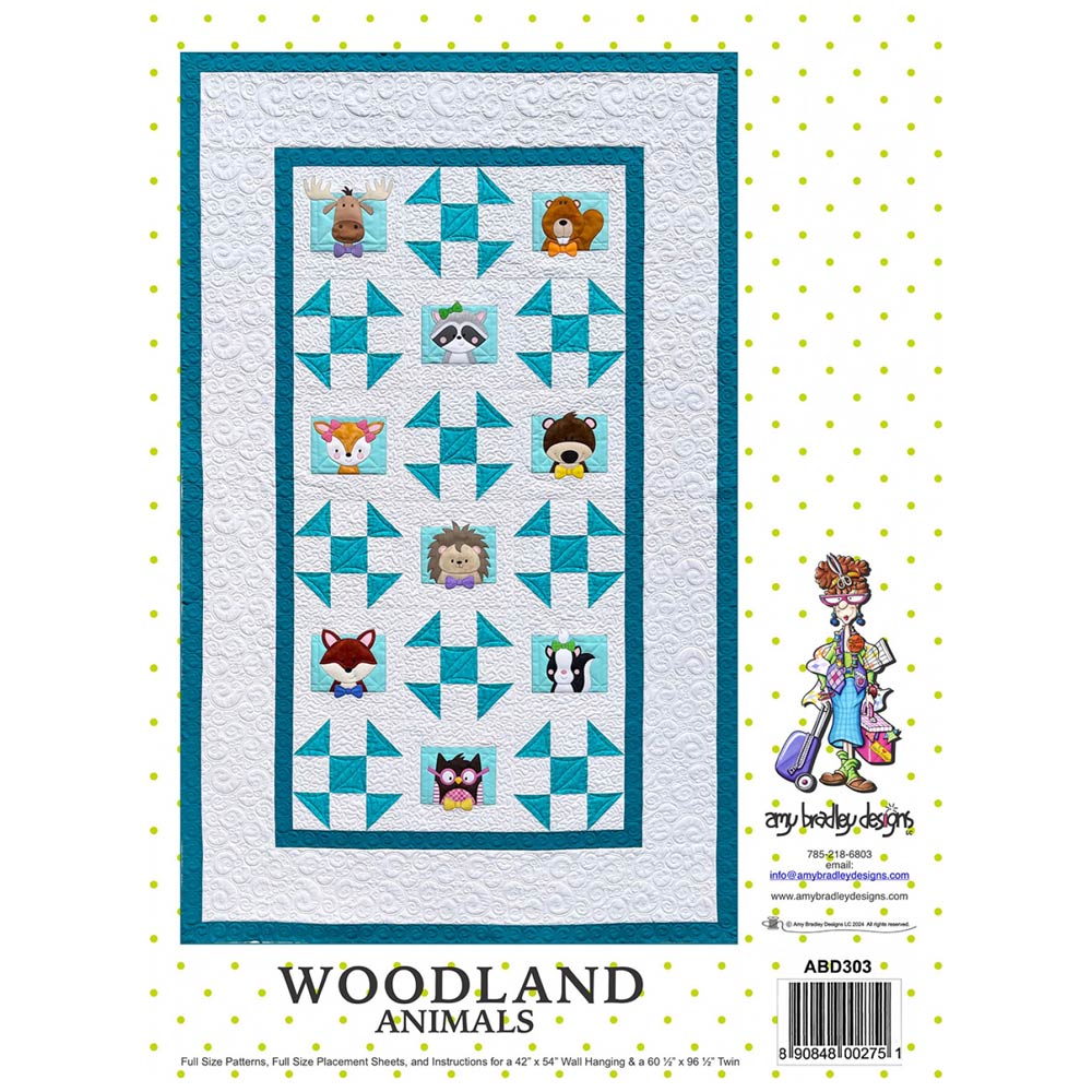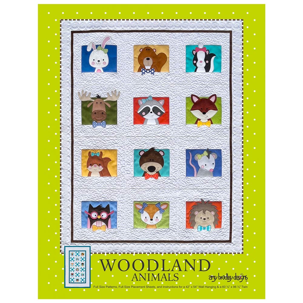 Woodland Animals quilt pattern includes full size patterns, full size placement sheets, and instructions to make a 42" x 54" wall hanging with twelve animal blocks and a 60 1/2" x 96 1/2" twin size quilt with nine animal blocks and nine pieced shoo-fly blocks. The technique to make the animal blocks is fusible applique. The block size is 12 1/2" x 12 1/2".